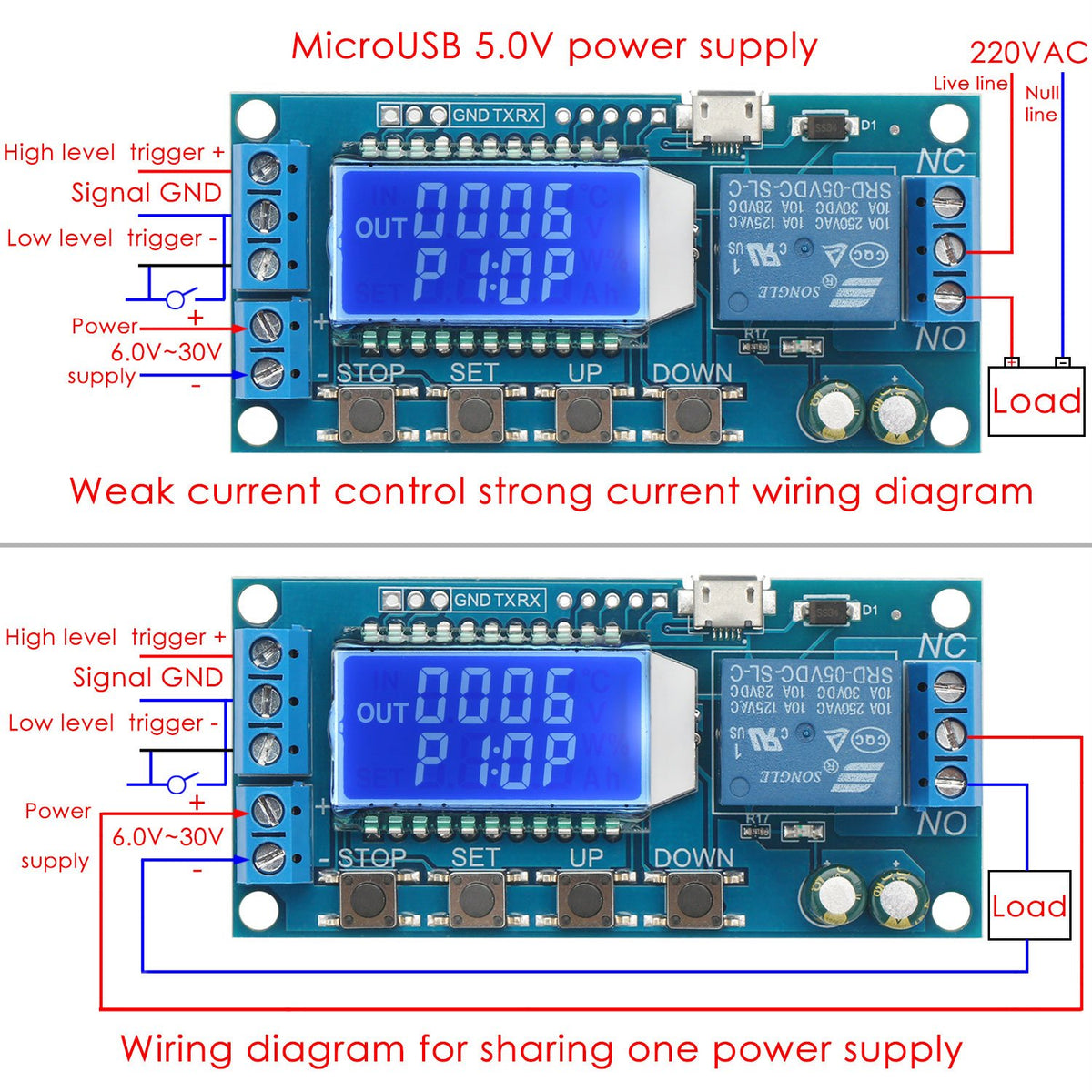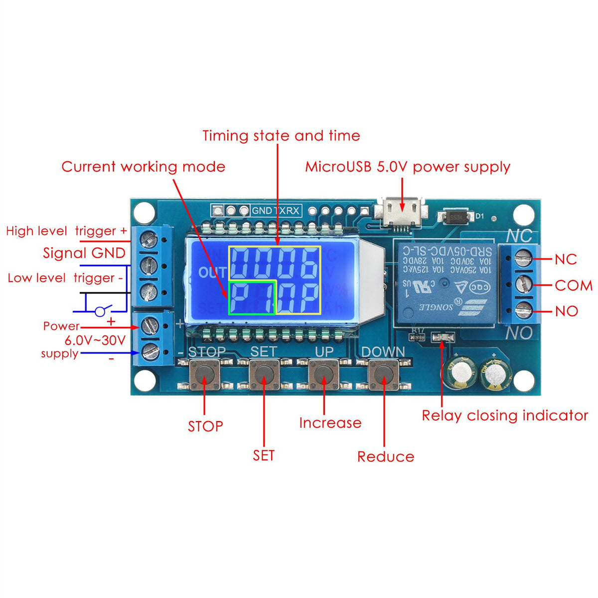 Product Parameters: Working Voltage: Dc 6V~30V, Support Micro Usb 5.0 V Power Supply Working Current: 50Ma. Static Current: 15Ma Max. Output Load: Dc 30V 5A And Ac 220V 5A. Trigger Signal Source: High Level Trigger (3.0V~24.0V), Low Level Trigger (0.0V ~0.2V), Switching Value Control (Potential Free Contact) Service Life: More Than 100,000 Times Working Temperature: -40-85C Additional Functions: A)Automatically Hibernation Function/ Low Power Function: In The Running Interface, Long Press Stop To Open Or Close Automatically Sleep Function. (L-P Selects On To Start The Hibernation Function, And Off Turns Off The Hibernation Function); B)Relay Function Selection: In The Operation Interface, Shortly Press Stop, The Relay Function Is Started Or Closed, 'On' Meets The Conduction Condition And The Relay Normally Turns On, 'Off' Meets The Conduction Condition And The Relay Does Not Turn On; In The 'Off' State, The System Flashes 'Out'. C)Parameters View: In The Operation Interface, Short Press Set To Display The Current Parameter Setting In The System, Without Affecting The System Normal Operation. D)Display Content Switching: In The P-5 P-6 Mode, Switch Display Content (Runtime/Cycle Times) By Pressing Down. Package Includes: 1* 12V Timer Relay