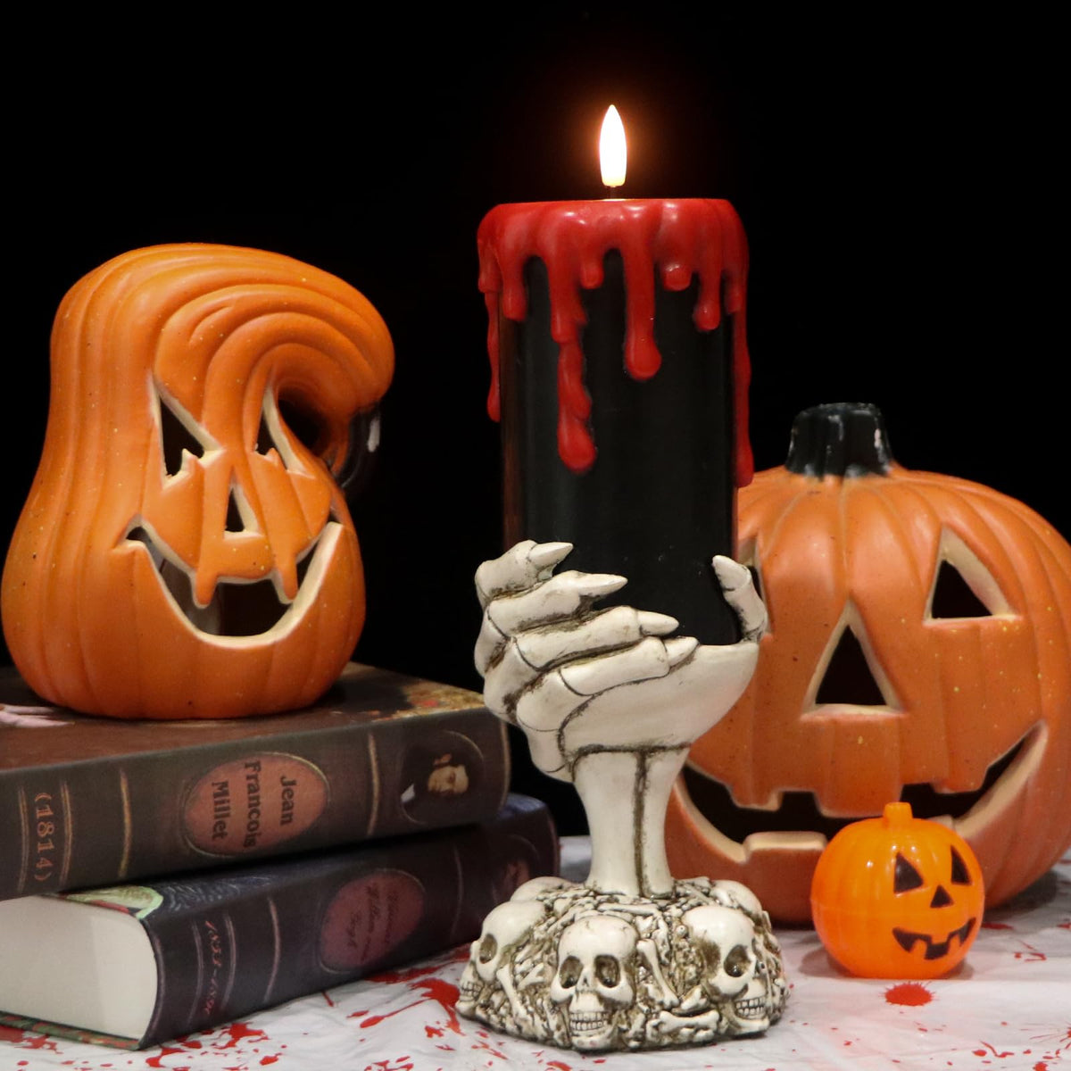 Black Flameless Flickering Candle With Timer, Blood Dripping Wax Effect Battery Operated Led Pillar Candle With Skeleton Hand Candle Holder Halloween Table Centerpiece Decor(4'' X 11'' )