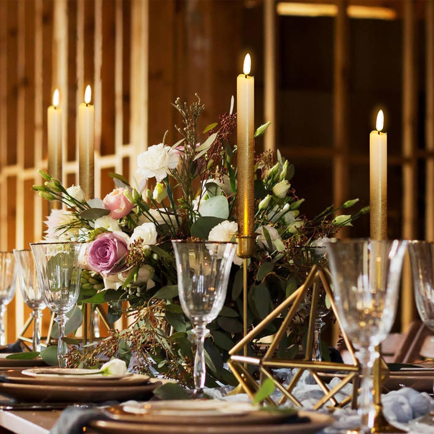 Dromance Gold Flameless Taper Candles Battery Operated With Remote Timer, Real Wax 3D Wick Flickering Led Taper Candles Dinner W