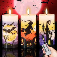 [Battery Operated Candles]: Each Flameless Flickering Candle Requires 2 Aa Batteries(Not Included), 400 Hours Long Lasting Life, No Need To Change Batteries Frequently For Whole Halloween Season Decor | [10-Key Remote And Timer]: A Multi-Functional 10-Key Remote Comes With Our Flickering Flameless Candles, Convenient One Press To Control All Real Wax Candles. 2/4/6/8 Hour Timer Modes Meet For Your Different Occasion Decor Needs, Once The Timer Is Set, Cycle Every 24 Hours | [Halloween Decor Lights]: All Battery Operated Flameless Candles Are Made By Real Wax With Dimmable Flickering Light, Real Candles Appearance But No Fire Danger, No Wax Melting Worries, Safety For Your Children, Elders, Pets For Your Indoor Halloween Decor | [Halloween Decoration Indoor]: Spooky Halloween Elements Include Witch, Bats, Castle, Pumpkin Decals Adds Festival Atmosphere In Your Room, Great Gifts For Friends And Kids. 3 Inches Led Candle Diameter Suitable For Mostly Candle Holders | [Satisfaction Guarantee]: Each Halloween Battery Candle Is Thoroughly Tested Before Leaving The Factory. If Any Problems Occurs To Our Flameless Pillar Candles, Please Kindly Contact Our Customer Support For Primary Service
