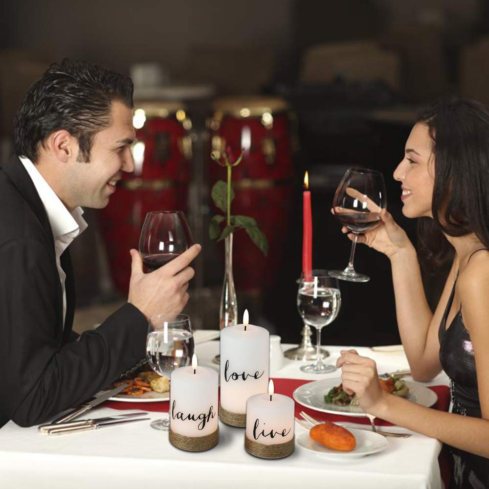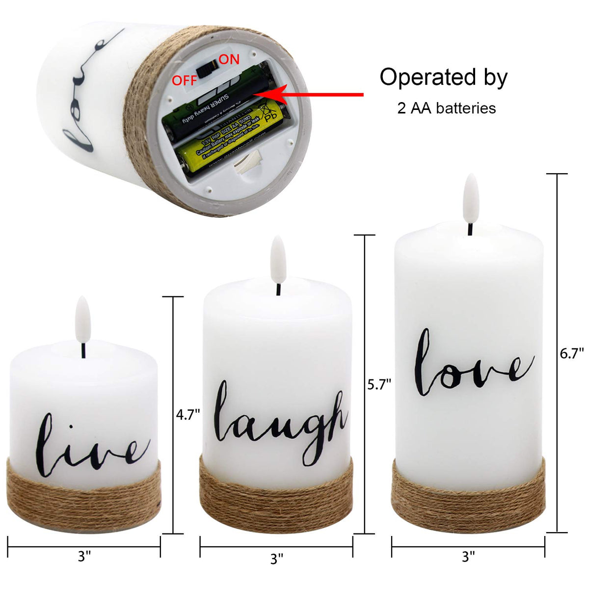 ?Realistic 3D Wick: All Electric Candles Are Made Of Pure White Real Wax With 3D Wick Led Flickering, Elegant And Gorgeous Appearance Make Them Look Like Real Candles, 3'' Candle Diameter Fit For Mostly Candle Holders | ?Live Love Laugh Decal&Hemp Rope: Beautiful And Simple Decals Design And Creative Hemp Rope Make Our Flickering Timer Candles Suitable For Various Style Home Decoration, A Great Addition To Your Wedding, Party, Birthday, Dinner, Halloween, Thanksgiving, Christmas Dinner Table, Window Centerpieces Decor Candles | ?Battery Powered: Each Indoor Flameless Pillar Candle Requires 2 Aa Batteries(Not Included), Long Lasting Life Allow These Candles Can Light Up Continuously Over 200 Hours. No Need To Worry About Candle Dripping Or Smoking, Safety And Clean Use For Children And Seniors | ?6 Hour Timer: Candle Bottom Switch(On/Off/Timer), When You Slide To Timer Sides, All Candles Will Run Into A 6 Hour Timer. For Example, If You Set The Timer At 16:00, Candle Will Light Up For 6 Hours And Automatically Turn Off At 22:00, And Turn On Again At 16:00 Next Day, Cycle Every 24 Hours | ?Satisfaction Guarantee: Each Flameless Candle Set Is Thoroughly Tested Before Leaving Our Factory, If Any Problems Occurs To Our White Led Candles, Please Kindly Contact Our Customer Support And We Will Offer You A Satisfactory Solution