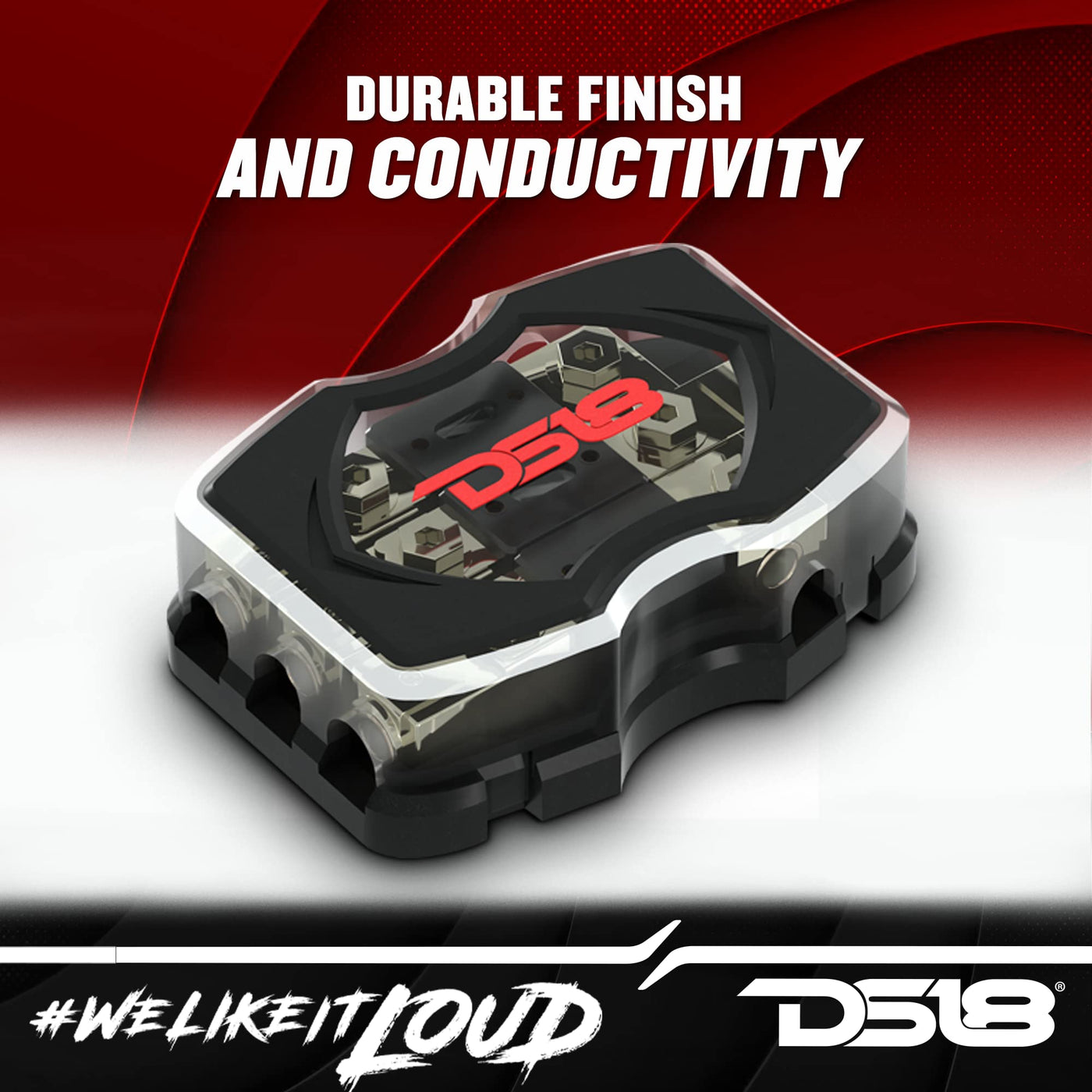 Q: Is the DS18 Fuse Holder compatible with different gauge wires?A: Yes, the DS18 Fuse Holder features one 0-Gauge input and three 4-Gauge outputs, allowing for versatile compatibility with various wiring configurations in automotive and audio setups.