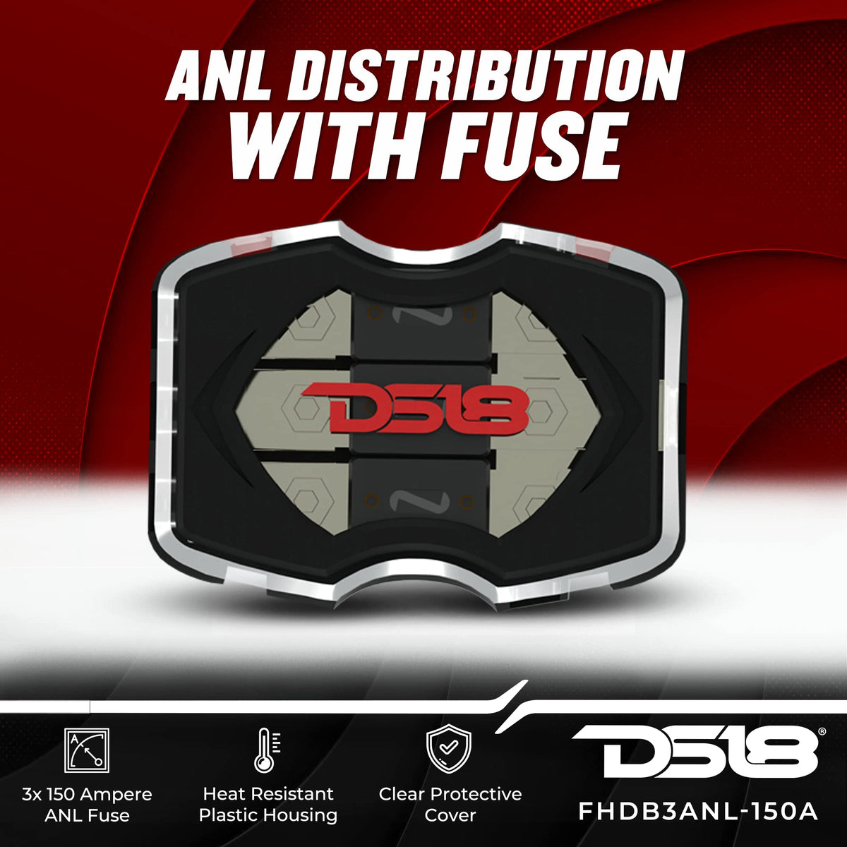 Q: What is the maximum amperage that the DS18 ANL Fuse Distribution Holder can handle?A: The DS18 ANL Fuse Distribution Holder is designed to handle a maximum of 150A, making it suitable for high-performance audio systems and other applications requiring efficient power distribution.