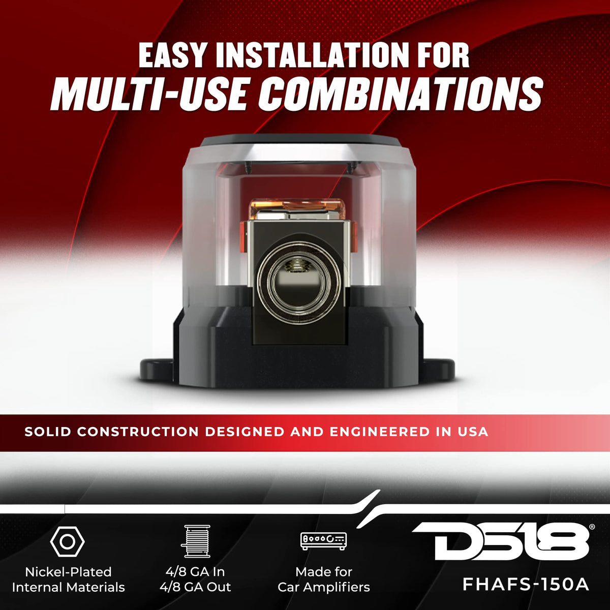 Q: Is the DS18 FHAFS-150A fuse holder easy to install?A: Absolutely! The DS18 FHAFS-150A fuse holder is designed for effortless installation, allowing for customizable setups with multi-use combinations to fit your specific needs.