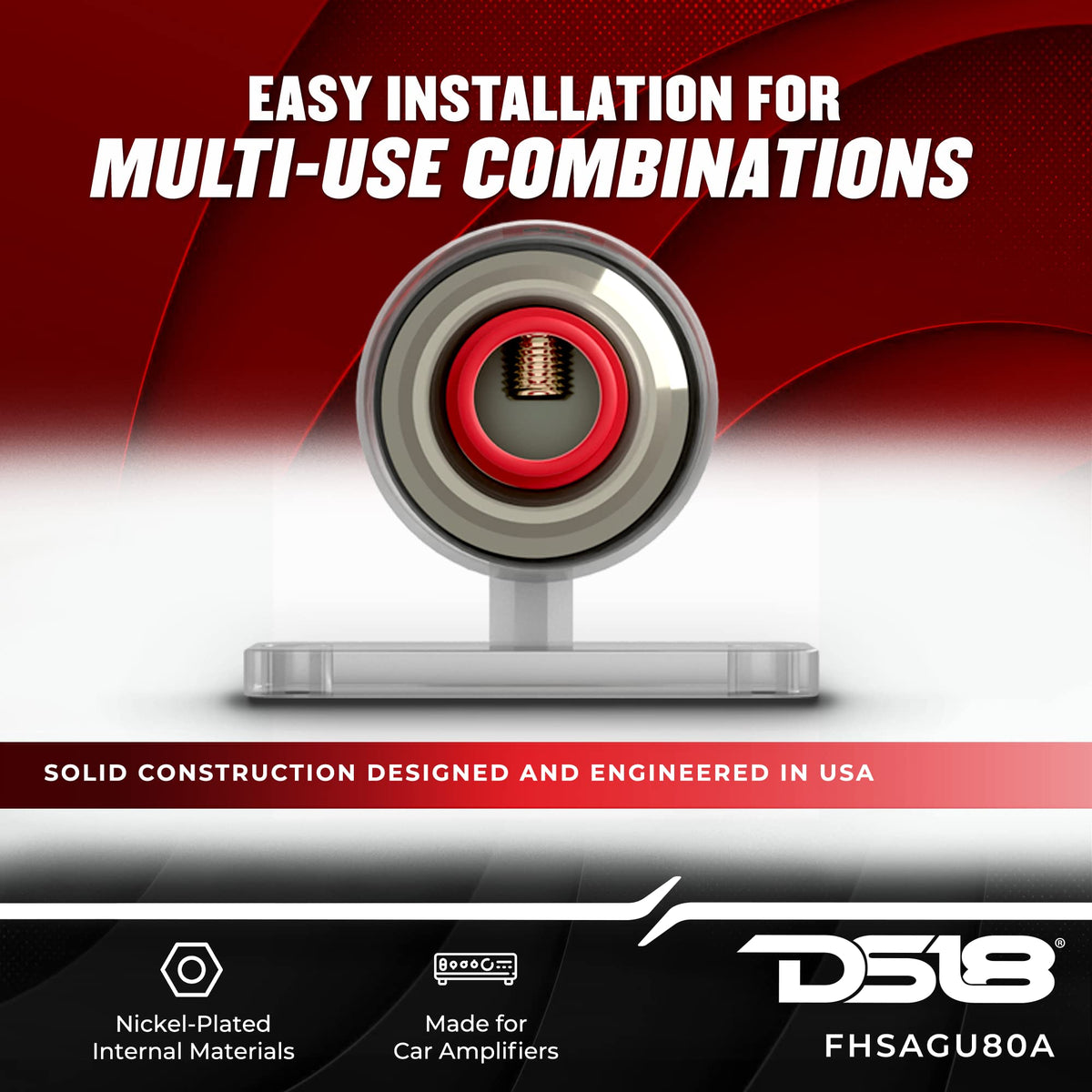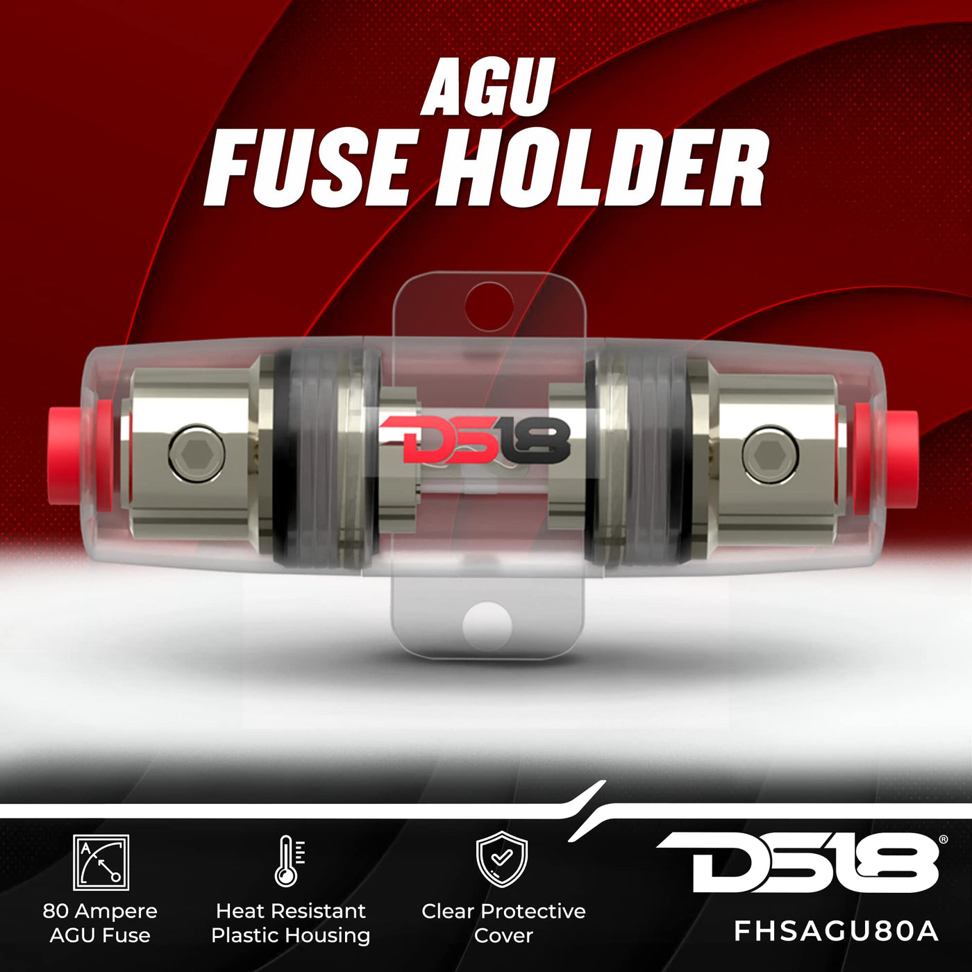 Q: Is the DS18 AGU Fuse Holder compatible with 4/8 gauge wires?A: Yes, the DS18 AGU Fuse Holder is compatible with both 4 and 8 gauge wires, allowing for flexible installation options based on your specific wiring needs.