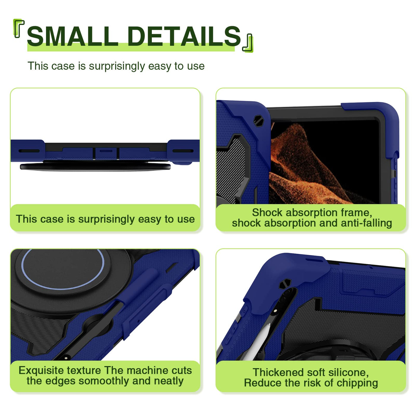 Big Kickstand On Back Meets Your Every Wanted Viewing Angles + Kids Drop Resistant Case Protects Of Tablet Safe Compatibility Designed For Samsung Galaxy Tab S8 Ultra 14.6 Inch 2022 Release (Models: Sm-X900/ Sm-X906). Not Compatible For Galaxy Tab S8 11 Inch(Models: Sm-X700/ Sm-X706)!!! Not Compatible For Galaxy Tab S8 + 12.4 Inch(Models: Sm-X800/ Sm-X806)!!! Attention: This Product Does Not Include The Screen Protector And Shoulder Strap. 6 Major Protections During Daily Use Shock Absorbing + Drop Defense + Impact Resistant Protection + Anti-Scratch+ Screen Protection + Heat Dissipation. Enough Thickness Soft Airbag Case For Ensuring Your Galaxy S8 Ultra Safe Even If Dropping From 5Ft Place, Save Screen Of Tablet Cracked. Soft Endothermic Sponge Helps To Dissipate Heat Viewing Your Tab S8 Ultra 2022 In Any Direction 360 Rotating Kickstand On The Back Provides Every Viewing Angles For Vertical And Horizontal Mode To Meet Your Every Ideal Viewing Angle. 3-Layer Full Body Protection Soft Thickness Airbag Tpu Bumper + Hard Pc Back Case + Front Frame Without Built In Screen Protector = Provide Comprehensive Protection For Your Tablet 2 Ways For Carrying Your Galaxy S8 Ultra Hand Grip For Allowing Your Hand To Hold Or Hang It On The Wall Or Any Other Place You Want, Also There Is Pen Holder On Back Can Store Your Pen.Pencil Is Not Included. Package Included 1 X Dteck Galaxy Tab S8 Ultra Case 1 X Random Color Stylus Pen 1 X Clean Cloth]