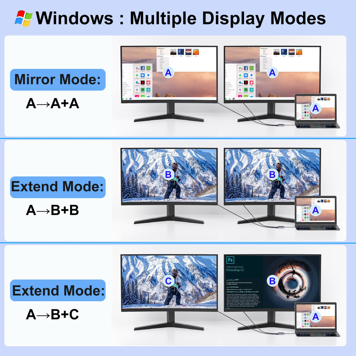 Q: Can I use the adapter to extend my display to two different monitors?A: Yes, if you are using a Windows operating system, the adapter allows you to extend your display to two different monitors. However, for Mac OS, due to system limitations, it only supports mirroring the display.