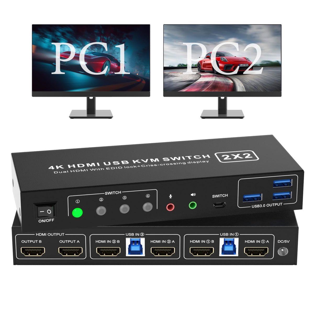 4K Hdmi Kvm Switch For 2 Computers Share 2 Monitors And 3 Usb 3.0 Devices. &Nbsp; With This 2 Port Usb 3.0 Dual-Monitor Hdmi Kvm Switch (Hdmi+Hdmi), You Can Easily Control 2 Signal Sources At The Same Time, Share The Same Keyboard And Mouse, And Share 2 Monitors. Note: Each Input Source Device Must Be Connected To Two Dual Monitors. &Nbsp; Product Features 1. 2 Computers Share One Set Of Keyboard, Mouse, 2 Monitors, And More Usb 3.0 Peripherals. 2. This Dual Monitor Hdmi Kvm Switch Supports Maximum Resolution Up To 4K 60Hz Yuv 4:4:4, Hdcp 1.4, Hdr 2.2, With Edid Emulator; Dual Monitors Output Support Up To 4K@60Hz For Extended, Mirrored Or Spliced Display(Depends On Your Computer'S Graphics Card.); 3. Support Cross-Display Between The Two Pcs On Two Monitors. 4. Compatible With Windows 11/10/7/2000/Xp/Vista, Linux, Unix, Ubuntu, Fedora, And Other Systems; 5. 2 Switching Modes: Button Switch And Wired Remote. 6. The Ports That Need To Plug In Hdmi/Usb Cables Are All Hidden Behind The Kvm, So The Desktop Doesn'T Get Cluttered; 7. No Complicated Installation Is Required, And Non-Professionals Can Easily Operate It. 8. Independent Audio Microphone Output. &Nbsp; &Nbsp; Installation Steps: &Nbsp; 1. Insert The Dc/5V Adapter Into The Kvm ; 2. Plug The Hdmi Cable Into The Kvm And Monitor;(Hdmi Output) 3. Plug The Hdmi Cable And Usb Cable Into The Kvm And Your Computer/Laptop (Hdmi Cables Are Not Included)(Input) Hdmi In1 A + Hdmi In1 B + Usb In1=Pc1 Hdmi In2 A + Hdmi In2 B + Usb In2=Pc2 4. Insert The Mouse And Keyboard Into The Kvm Switch 5. If Needed, You Can Connect A Microphone And Audio Port Note: &Nbsp; 1. Most Of The Reasons Why Only One Video Output Works Is Because Of An Incorrect Connection. Please Make Sure Each Computer Has2 Hdmi Cables Connected To The Kvm. &Nbsp; 2. If The Kvm Switch Does Not Work, You Can Turn Off The Switch On The Panel And Turn It On Again After 2-3 Seconds, And It Will Return To Normal. &Nbsp; 3. Please Check Whether Hdmi In1 A,Hdmi In1 B And Usb In 1 Correspond, And Whether Hdmi In2 A,Hdmi In2 B And Usb In 2 Are Corresponding. Mixed Insertion Is Not Supported. &Nbsp; 4.&Nbsp;Note: Hdmi Cables Are Not Included &Nbsp; Usb 3.0 Dual Monitor Kvm Support 4K@60Hz Supports High Resolution Up To 3840*2160@60Hz And Downwards. Note: Only When Both Your Computer Graphics Card, Monitor And Cable All Support 4K@60Hz, Then You Can Get The 4K@60Hz Effect, So If You Want The Maximum Resolution You Have To Check Your Devices First. &Nbsp; Support Edid Lock Screen Kvm Switch 2 Monitors 2 Computers Can Simulate The Edid Of The Display, When The Monitor Is Switched Between 2 Computers, The Original Window Order Will Not Change. &Nbsp; &Nbsp; How To Switch Our Kvm Switch Dual Monitor Support Panel Switching And Remote Control Switching Please Note That The Switching Buttons Below Correspond To The Switching Modes. &Nbsp; Button 1:&Nbsp;Output&Nbsp;A=Hdmi In 1 A, Output&Nbsp;B=Hdmi In 1 B Button 2:&Nbsp;Output&Nbsp;A=Hdmi In 2 A, Output&Nbsp;B=Hdmi In 2 B Button 3:&Nbsp;Output&Nbsp;A=Hdmi In 1 A, Output&Nbsp;B=Hdmi In 2 A Button 4:&Nbsp;Output&Nbsp;A=Hdmi In 2 A, Output&Nbsp;B=Hdmi In 1 A &Nbsp; Wired Remote Control Supports Wired Remote Switching For Easy Cable Management, With Digital 1/2/3/4 Indicator Light. &Nbsp; Switch By Panel Button Push-Button Design Allows For One-Touch Switching Using A Button On The Kvm Switch Box, Eliminating The Need To Plug And Unplug Cables Frequently, Saving Space And Time. &Nbsp; Led Indicator When Switching To Which Pc, The Led Will Tell You Whether Pc1 Or Pc2 Is Active. &Nbsp; Audio And Microphone Output Monitor Switch For 2 Computers Comes With A 3.5Mm Audio Jack Port With A Dac Chip Inside, Which Can Be Inserted Into A 3-Segment 3.5Mm Earpiece Device, And A 3.5Mm Microphone Interface, Which Can Be Inserted Into A 3-Segment Microphone &Nbsp;