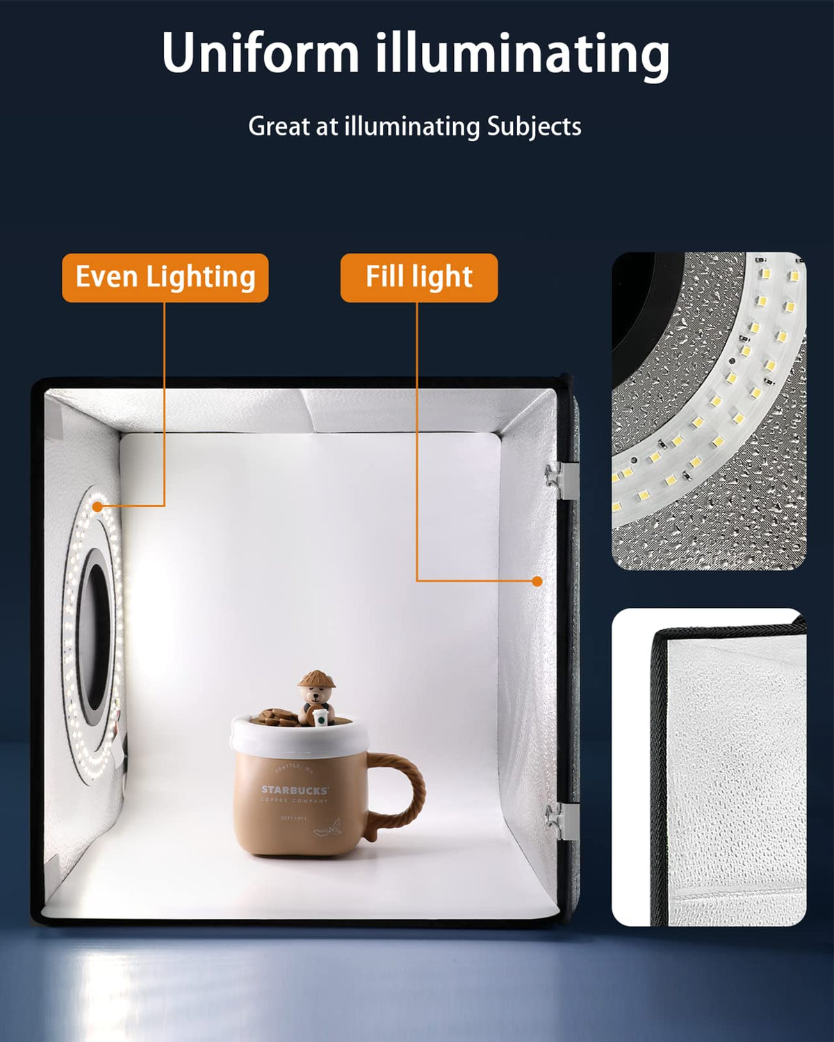 Q: How does the lighting work in this photography light box?A: This light box features 120 ultra-bright LED bulbs with 10 brightness settings, allowing you to adjust the light from 0% to 100% for optimal illumination. It also has a high Color Rendering Index (CRI) of 95+ to ensure accurate color representation.