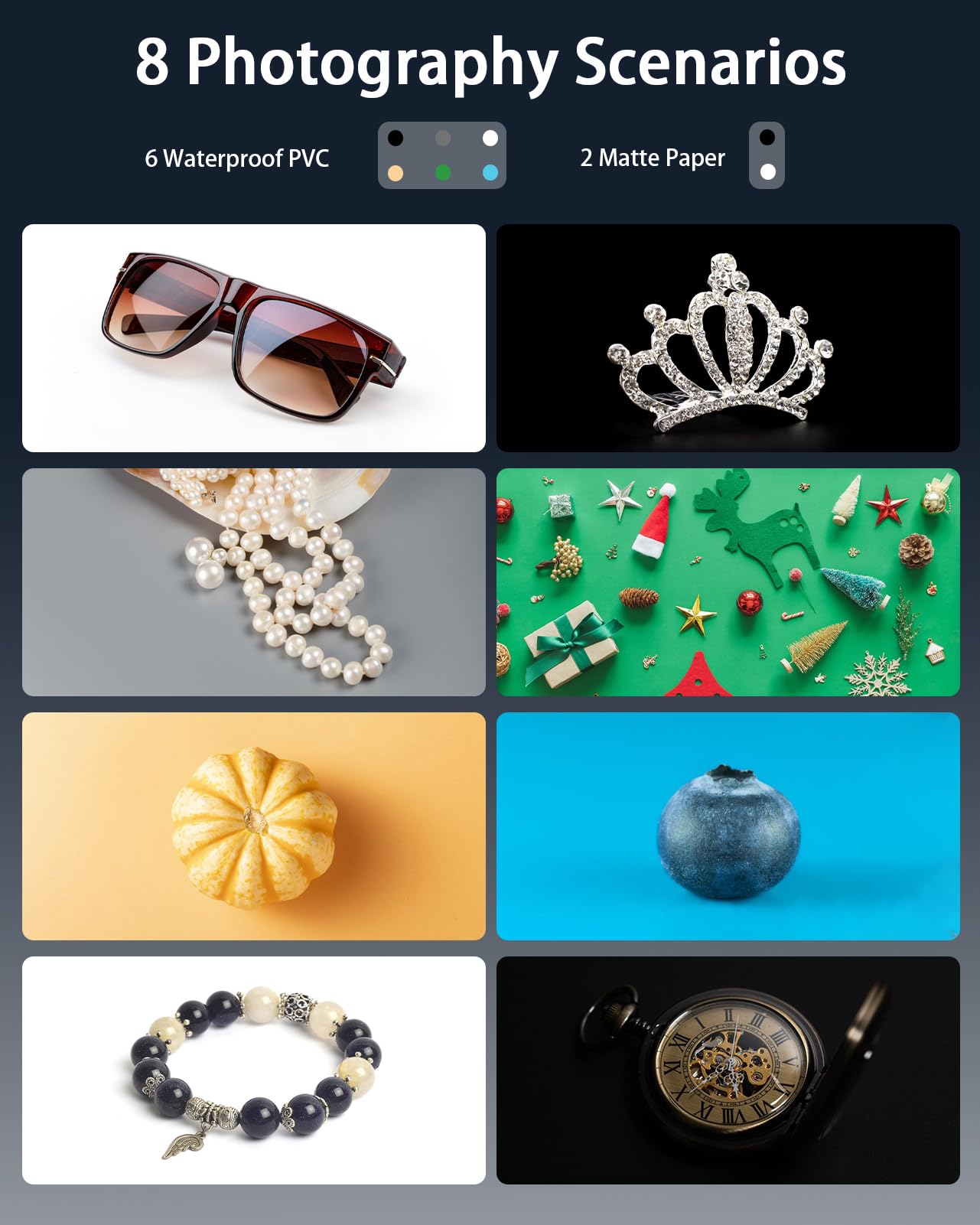 Q: Are the backdrops included with the light box easy to clean?A: Yes, the light box comes with 6 PVC backdrops and 2 matte paper backdrops. The PVC backdrops are waterproof and durable, making them easy to clean for repeated use.