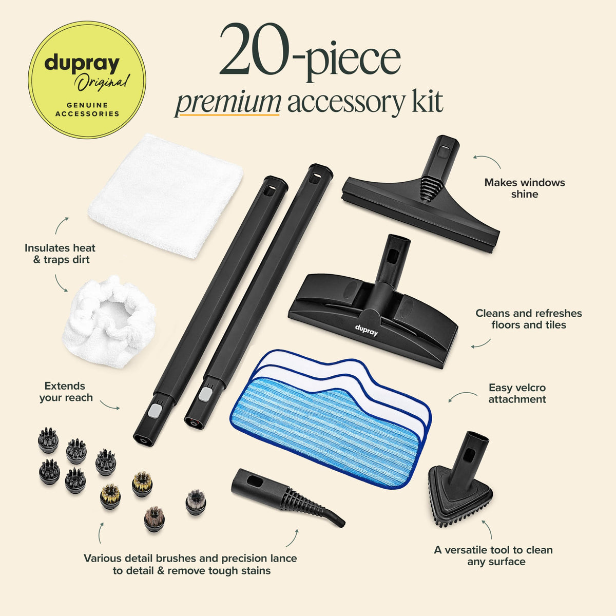 The Dupray Neat Steam Cleaner Is A Professional, Efficient, Ultra-Reliable All-In-One Cleaning Solution Designed For Superior Performance, Ease Of Use, And Long-Lasting Durability. Offering The Power Of Much Larger Commerical Units, This Steam Cleaner Easily Tackles Dirt, Grease, And Stains On A Wide Variety Of Surfaces And Flooring. It Is Perfect For Floors, Furniture, Kitchen Appliances, Car Interiors, Grout, Tiles, Bathrooms, And More. Experience Powerful Cleaning Results With The Dupray Neat Steam Cleaner, Transforming Your Cleaning Routine With Effortless Precision. Elevate Your Cleaning Experience With The Dupray Neat Steam Cleaner + 20-Piece Bundle. This Combination Is Designed To Tackle A Wide Range Of Cleaning Tasks, Offering Versatility And Efficiency For Your Home. Give Your Home A Deep Clean And Experience Perfect Results With The Dupray Neat Steam Cleaner. Whats Included Floor Tool (X1) : Efficiently Cleans Large Surfaces Such As Floors. Steam Lance (X1) : Ideal For Precise Cleaning Of Smaller, Detailed Areas. Triangle Tool (X1) : Perfect For Reaching Corners And Other Tight Spaces. Window Tool (X1) : Provides Streak-Free Cleaning For Windows And Mirrors. Extension Tubes (X2): Extend Your Reach For High Or Hard-To-Access Areas Without Compromising Steam Pressure. Brass Brushes (X2) : Designed For Medium-Duty Scrubbing, Particularly Useful For Tough Grout Areas. Horsehair Brush (X1):Gentle Cleaning On Delicate Surfaces, Ideal For Surfaces That Could Scratch Or Dull Easily Stainless Steel Brush (X1): Heavy-Duty Cleaning On Tough Surfaces To Remove Rust And Burnt-On Grease. Nylon Brushes (X5): Gentle Yet Effective Brushes For Delicate Surfaces, Ensuring No Abrasion. Microfiber Pads (X3): Soft, Machine-Washable Pads Designed To Lift And Trap Dirt For A Thorough Clean Without Scratching Delicate Surfaces. Microfiber Cloth (X1): Ultra-Soft And Versatile Cloth For Various Cleaning Tasks. Microfiber Small Bonnet (X1) : Works With The Triangle Tool To Lift And Trap Dislodged Dirt Effectively.