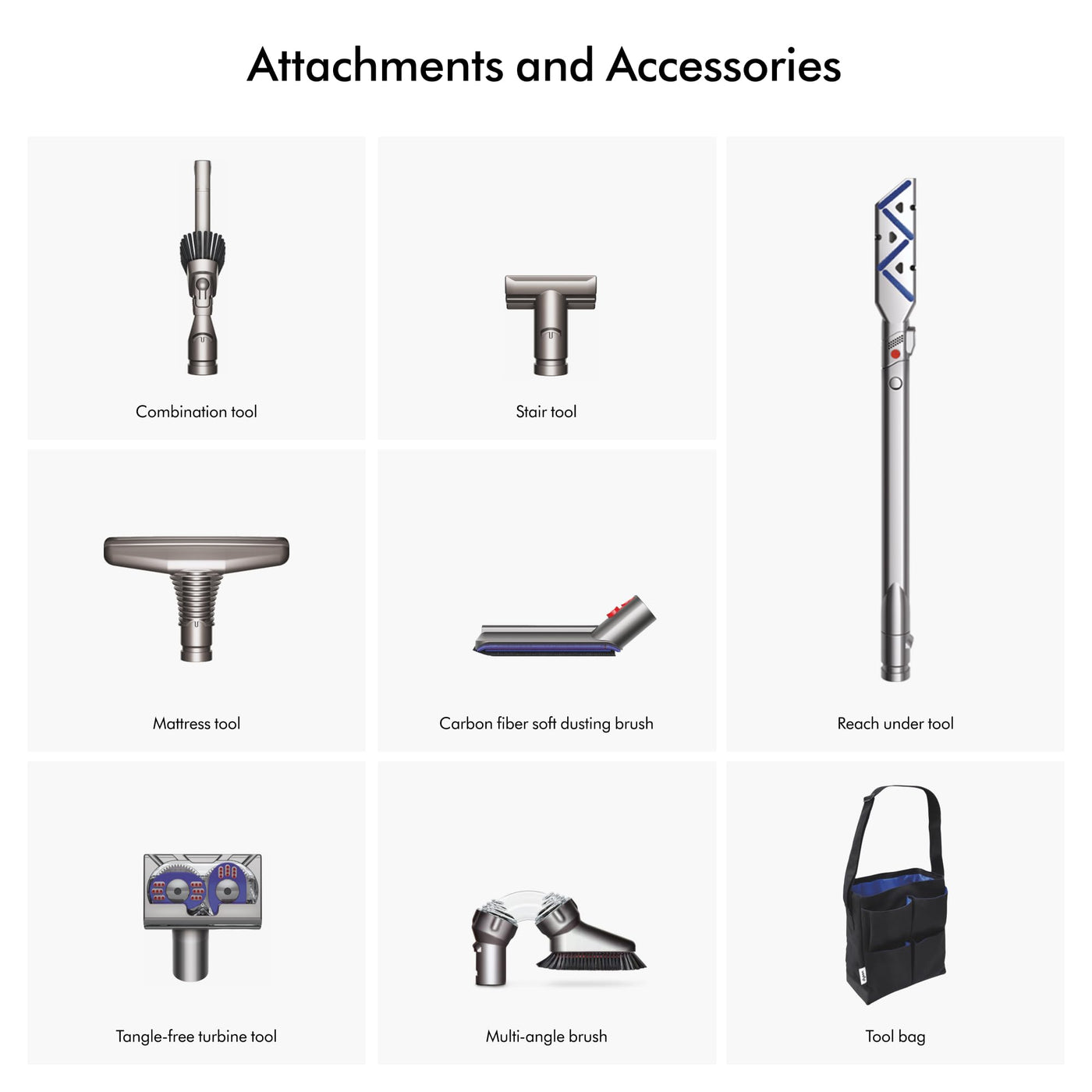 Q: What accessories are included with the Dyson Ball Animal Total Clean vacuum?A: This vacuum comes with nine Dyson-engineered accessories, including a tangle-free turbine tool, combination tool, multi-angle brush, stair tool, reach-under tool, carbon fiber soft dusting brush, mattress tool, and a tool bag, making it versatile for all cleaning tasks.