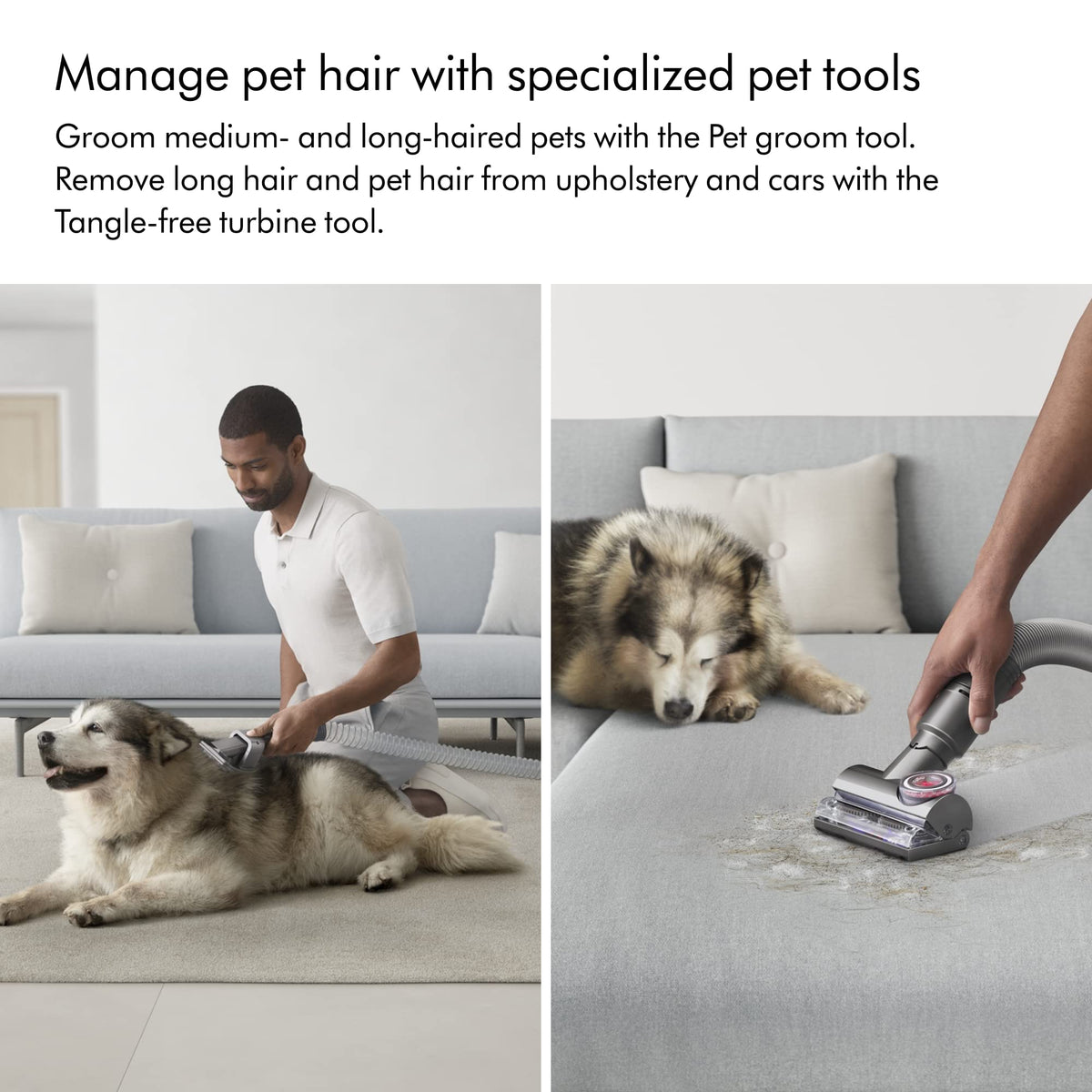 Q: What makes the Dyson Ball Animal 3 Extra ideal for pet owners?A: The Dyson Ball Animal 3 Extra is designed specifically for pet owners, featuring a Groom tool that removes loose pet hair and allergens directly from your pet before they can spread throughout your home. Its de-tangling technology also prevents hair from wrapping around the brush bar, ensuring efficient cleaning.