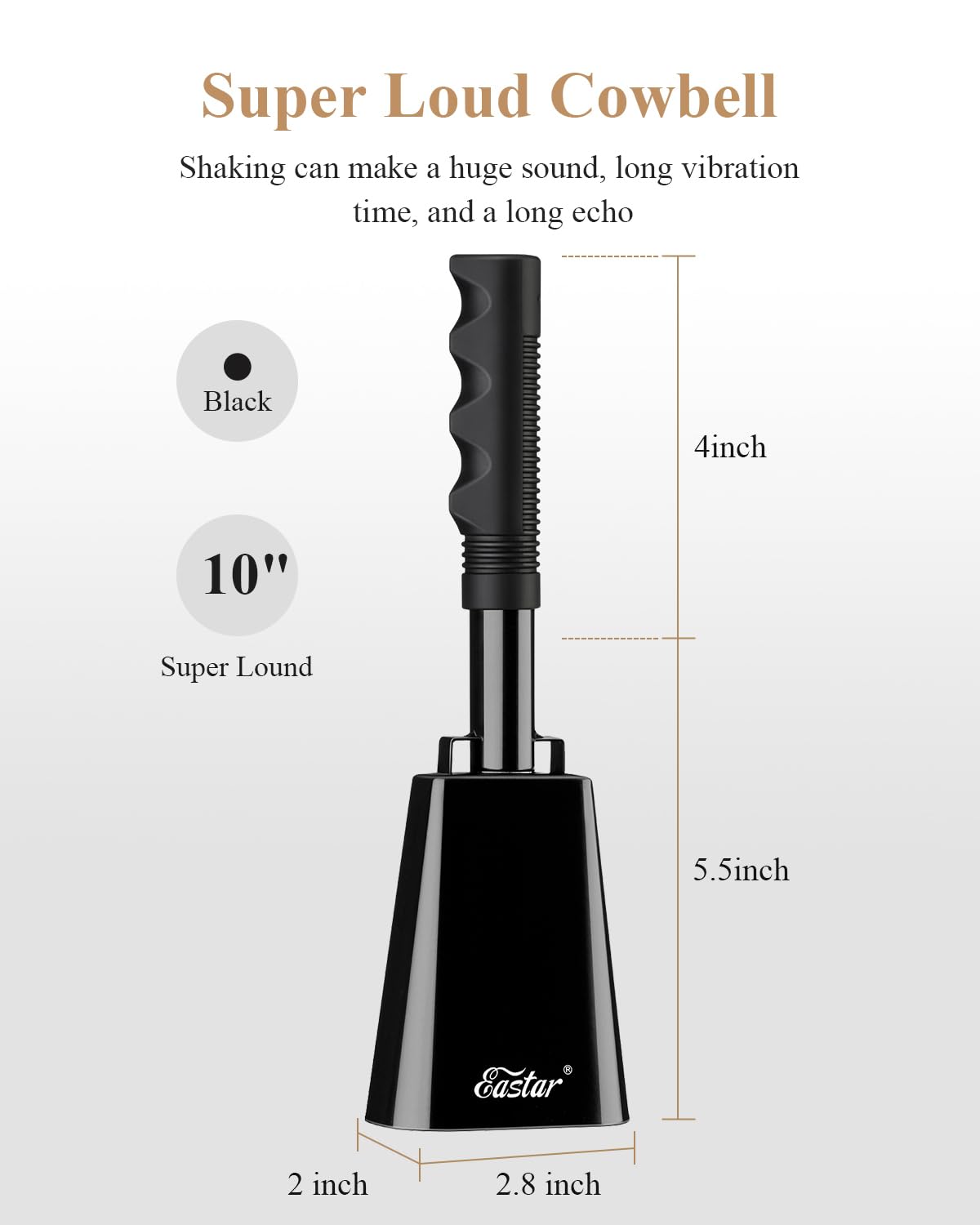 Its Always Right To Choose Eastar Music About Cow Bell Cowbell Is A Hand Percussion Instrument Used In Various Styles Of Both Popular And Classical Music In Order To Help Identify The Herd To Which These Animals Belonged, Herdsmen Placed These Bells Around The Animals Necks As The Animals Moved About The Bell Would Ring, Thus Making It Easier To Know The Animals Whereabouts Though The Bells Were Used On Various Types Of Animals, They Are Typically Referred To As Cowbells Due To Their Extensive Use With Cattle Want To Be The Loudest Fan In The Stadium This Cowbell Is Designed For Serious Unofficial Cheerleaders Switch To The Eastar Cow Bell To Save Your Voice And Cheer It Up Show Off Teamwork Or Personalize Each Teamwork The Smooth Exterior Surface Of Each Bell Is Ideal And Can Be Decorated And Customized With Stickers, Decals, Paints, Or Permanent Markers Perfect As A Help Bell To Catch Someones Attention Shake With Excitement And Cheer On Your Favorite Team, Help Spread Your Public Message More Clearly, Help With Sales At A Market, Or Let Your Kids Know To Come Home From Playing Outside The Loud Ringing Is Also An Important Safety Tool For The Elderly Or Handicapped To Call For Assistance Specifications Color: Black Quantity: 2 Size: 10 X 43 X 25 Inch (254X11X6Cm) Weight:500G11Lb Material: Sturdy Iron, Pvc Rubber Plastic Handle Usage: Shaking Customer Service 30-Day Unconditional Refund Eastar Adheres To The Service Concept Of Customer First Contact Us Anytime If You Have Questions