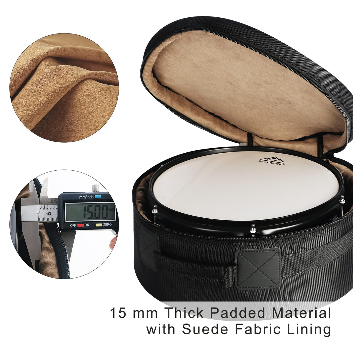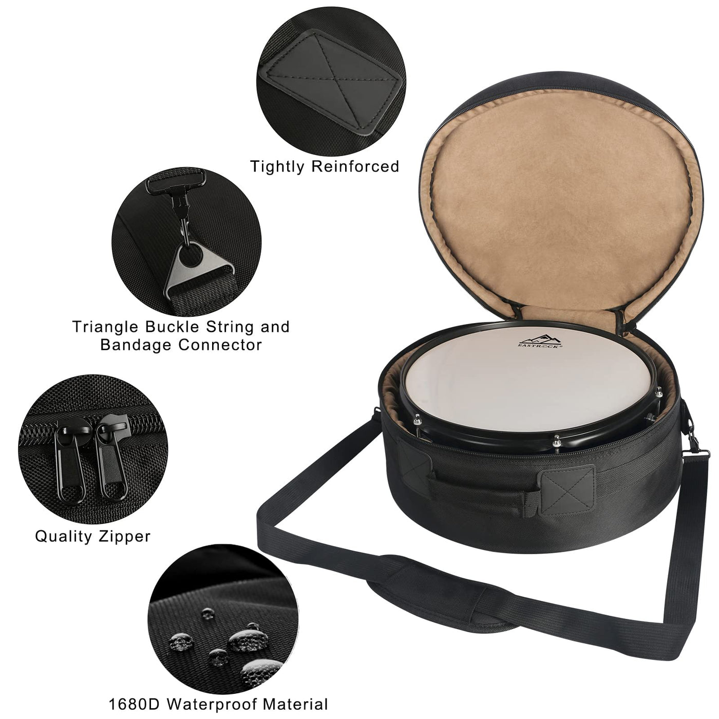 Snare Drum Bag Cases High Quality Dual Zippers, Adjustable Shoulder Strap, Reinforced Hand Strap, Also Designed With Triangle Buckle String And Bandage Connector, Keep It Durability And Functionality. Padded With 10Mm Pearl Cotton And 4Mm Sponge, Lined With Suede Fabric, Maximum Protection Of Your Expensive Drums. Adjustable Shoulder And Hand Straps For Easy Carrying. Exterior Is 1680D Waterproof Environmentally Material, Bottom Anti-Friction Design, G Reat Choice For Travel, Gig Or Outdoor Activities.