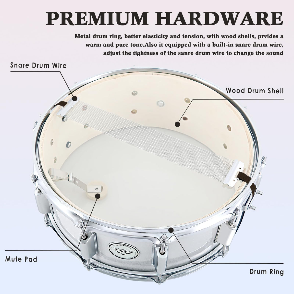 Eastrock Snare Drum 14X5.5 Inches For Student Beginners With Gig Bag, Drumsticks, Drum Keys, Coated Material Drum Head, Off Whit