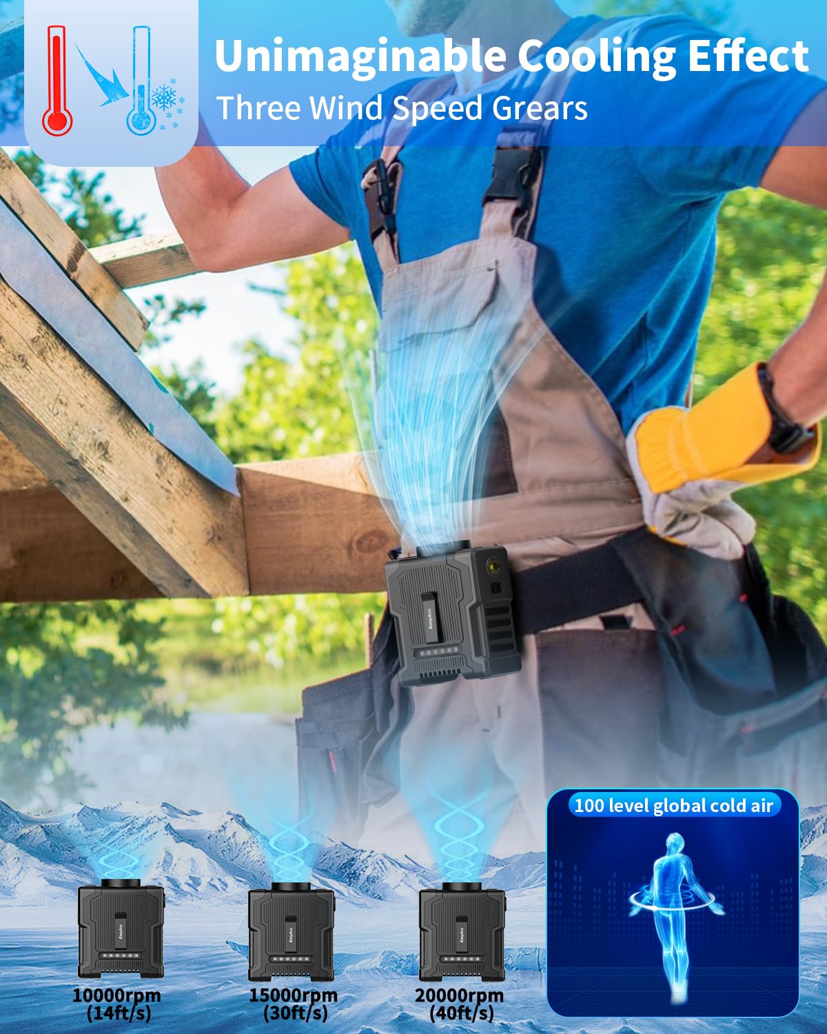 Q: What is the maximum airflow speed of the EasyAcc Waist Fan?A: The EasyAcc Waist Fan features an upgraded maximum airflow speed of up to 20000 RPM, making it 100% more powerful than other portable waist clip fans.