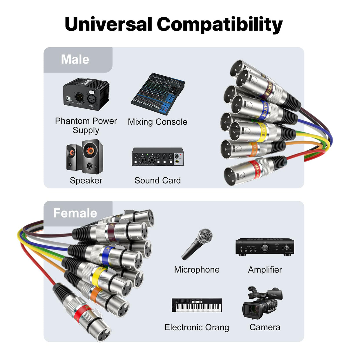 Q: Is the EBXYA XLR Snake Cable compatible with all audio devices?A: Yes, the EBXYA XLR Snake Cable is compatible with any device equipped with a 3-Pin XLR female to male connection. This includes microphones, mixing boards, and audio interfaces commonly used in recording studios and live sound setups.