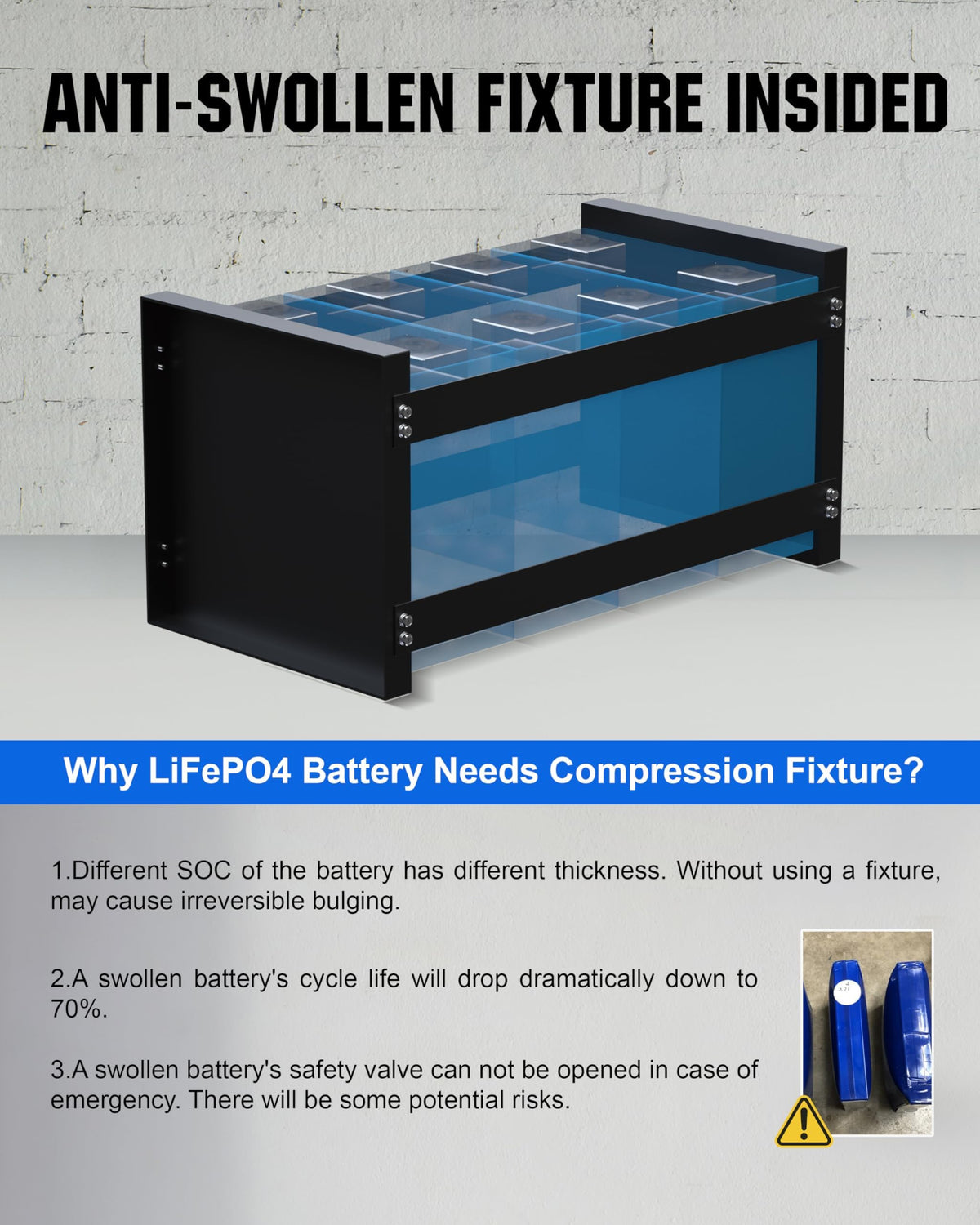 [Bluetooth App Monitoring] Eco-Worthy 12V 280Ah Smart Lifepo4 Lithium Battery Is Built-In Upgraded Smart Bms, Accessed Bluetooth 5.0 Module, Allows You To Monitor The Battery Information In Real Time Through Eco-Worthy App. You Can Read The Battery Voltage, Current, Battery Capacity And Other Important Information At Any Time. Bluetooth Connection Range: No More Than 15 Meters From The Battery | [Advanced Compression Fixture] Our Lifepo4 Battery Feature A High-Strength Metal Frame Inside That Provides Enhanced Battery Protection, Shock Stability And Controlled Compression To Prevent Expansion, Ensuring Long-Term Durability | [Low-Temperature Protection] This 12V Lithium Battery Features A 200A Bms With Multiple Protections, Including Low-Temperature Protection. Charging Stops Below 19.4