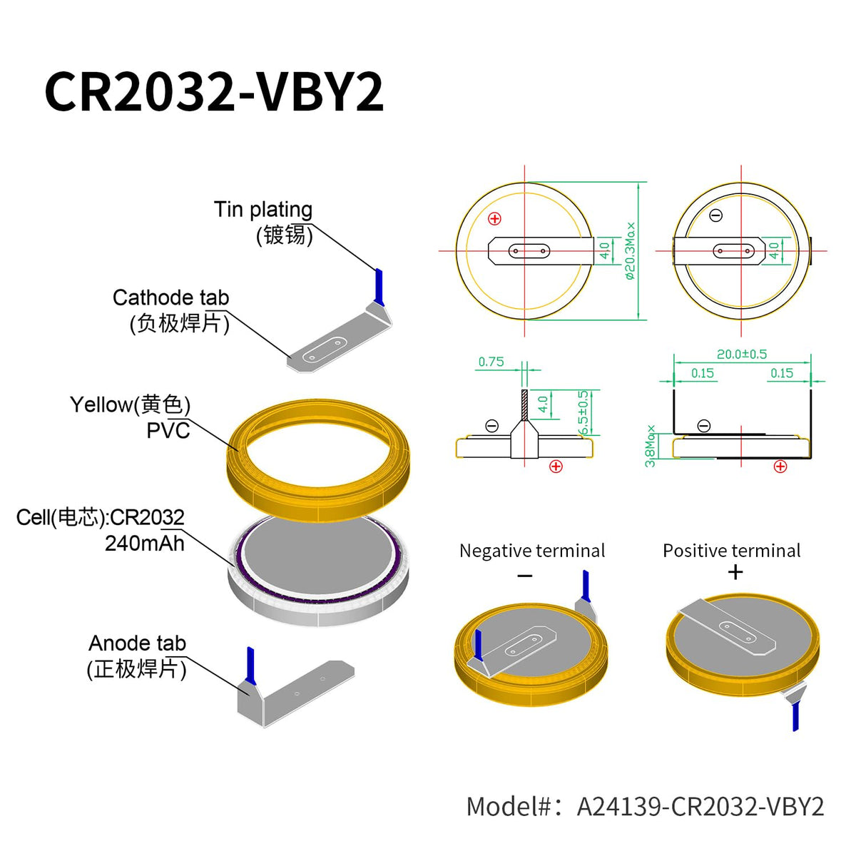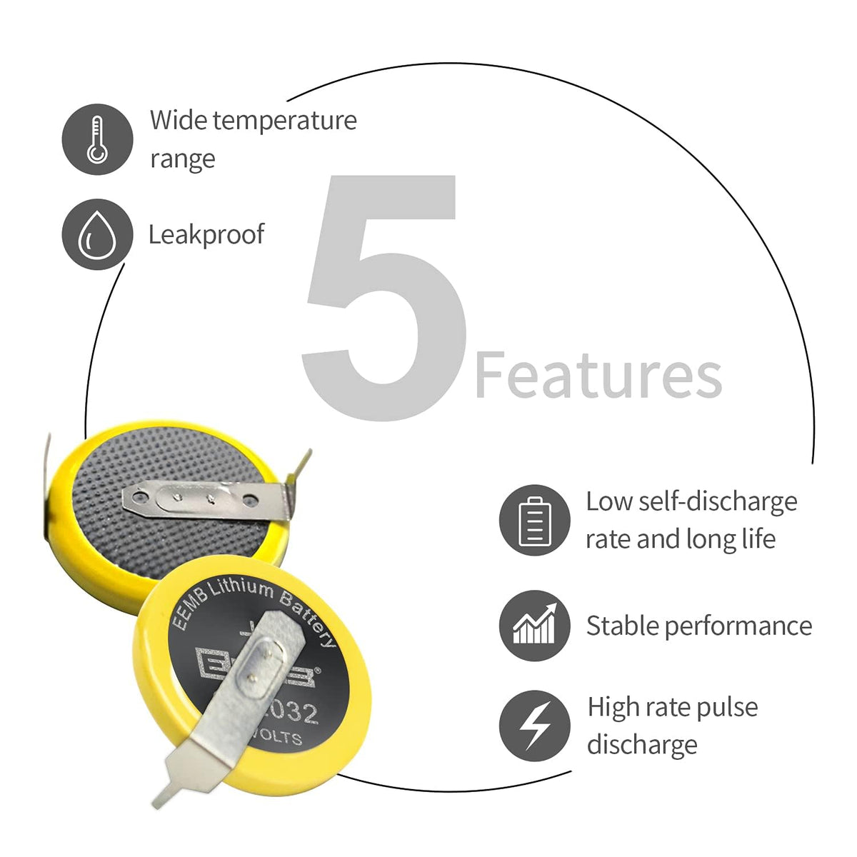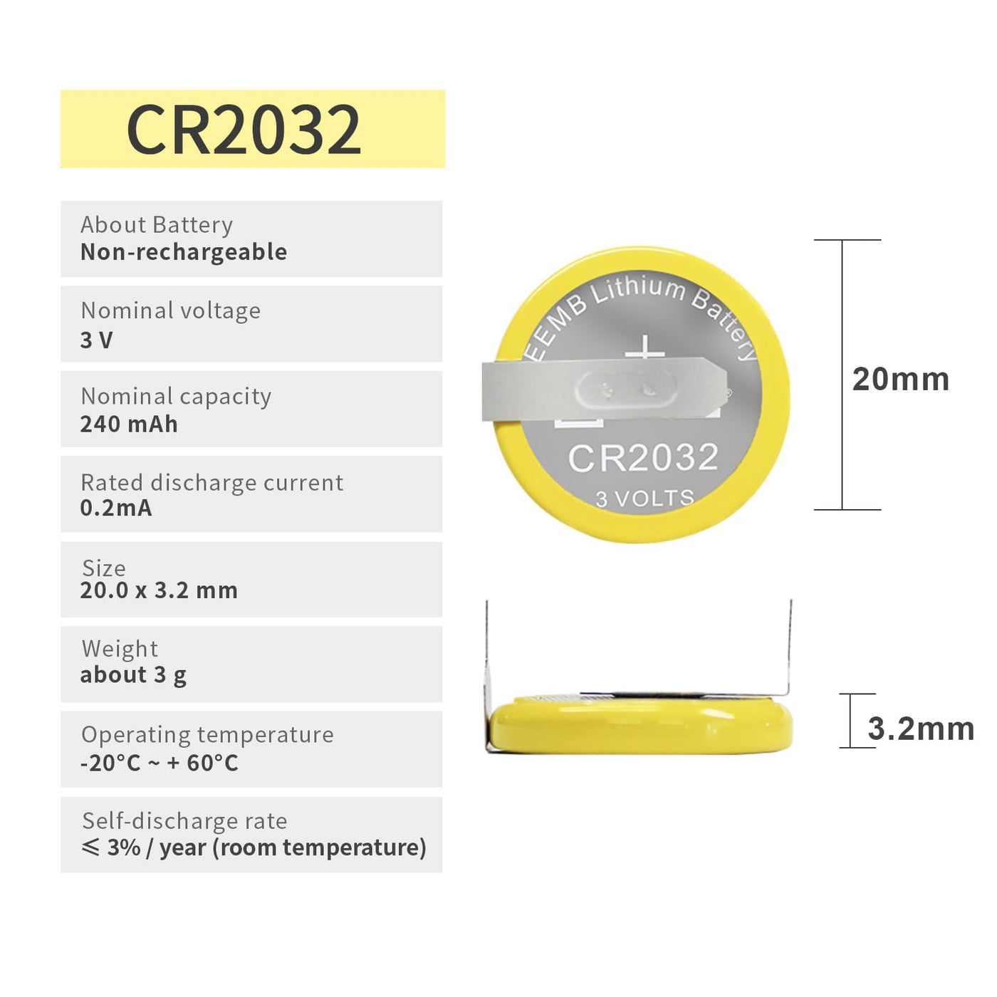 Description:Eemb Batteries Are Ul Certified With High Reliability, Light Weight And 3V Operating Voltage. It Operates Over A Wide Temperature Range Of -20 C To + 60 C. It Has A Low Self-Discharge Rate And A Long Shelf Life. The Eemb Battery Has Stable Discharge And Low Leakage Rate.Specification:Cr2032 Li-Mno2 Coin Battery With Tabsnon-Rechargeablebattery Capacity: 240 Mahworking Voltage: 3 Vrated Current: 0.2 Matemperature Range: -20 To + 60 Cdiameter: 20Mmthickness: 3.2Mmweight: 3 Greplacement Battery:Please Confirm The Battery Model Before Replacing The Battery.First Clean The Battery Card Slot, Then Hold The Battery Edge By Hand And Install The Fixed Battery (Do Not Touch The Positive And Negative Poles At The Same Time To Avoid Discharge)For Your Safety, Please Keep It Away From Children To Avoid Swallowing.Application:Electronic Scales, Electronic Dictionaries, Car Key Remotes, Electronic Watches, Thermometers, Electronic Kits, Blood Glucose Meters, Toys And Some Small Appliances.