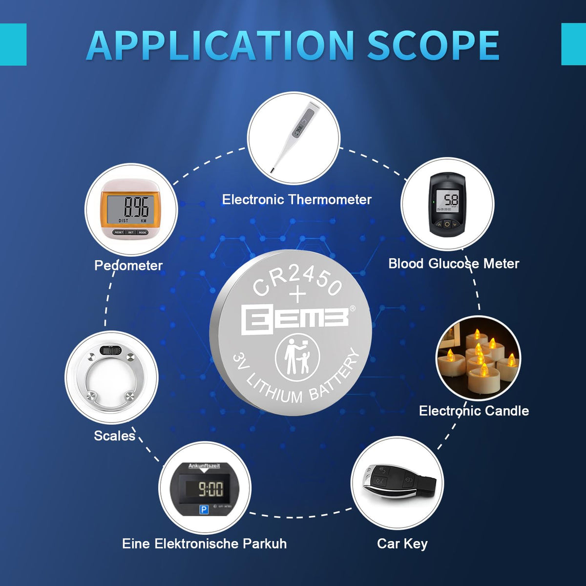 Q: What devices are compatible with the EEMB CR2450 Lithium Battery?A: The EEMB CR2450 Lithium Battery is compatible with a wide range of devices including remote controls, car key fobs, electronic watches, thermometers, blood glucose meters, and various small electronic appliances.