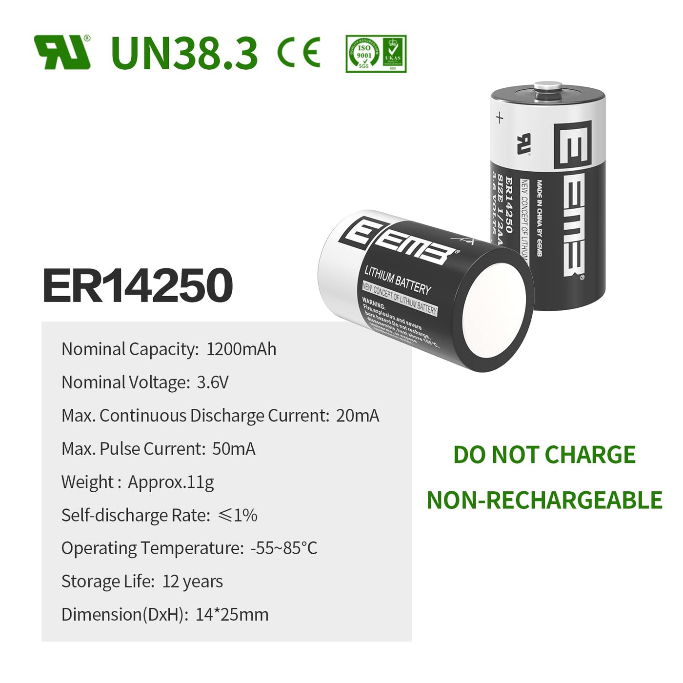 Eemb Er14250 Nonrechargeable 3.6V Lithium Battery Ls14250 Li-Socl2 1/2 Aa Size 1200Mah High Capacity Ul Certified Single-Use 3.6