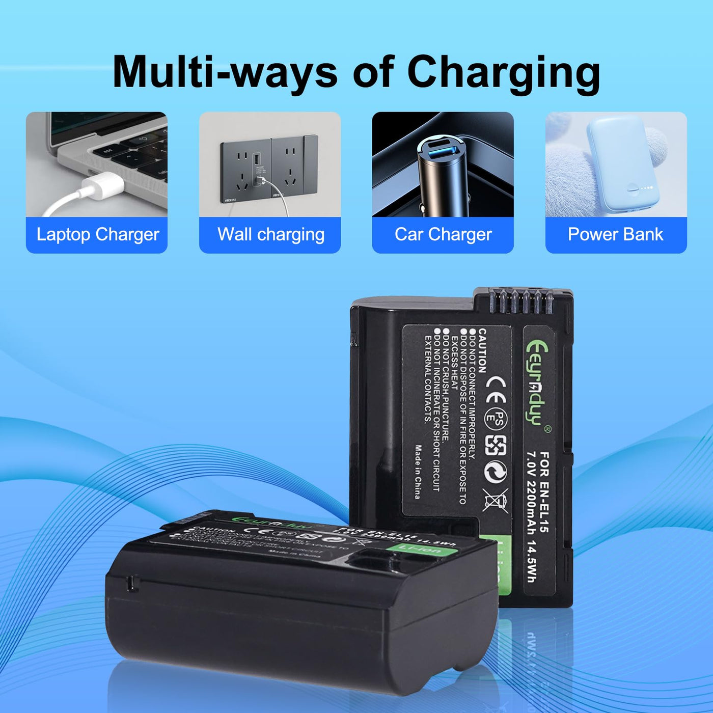 Eeyrnduy En El15 2 Pack Batteries For Nikon Z6 Z7 Z8 D750 D850 D7000 D7500 D7100 D7200 D500 D600 D610 D800 D810 D850 Camera 2200