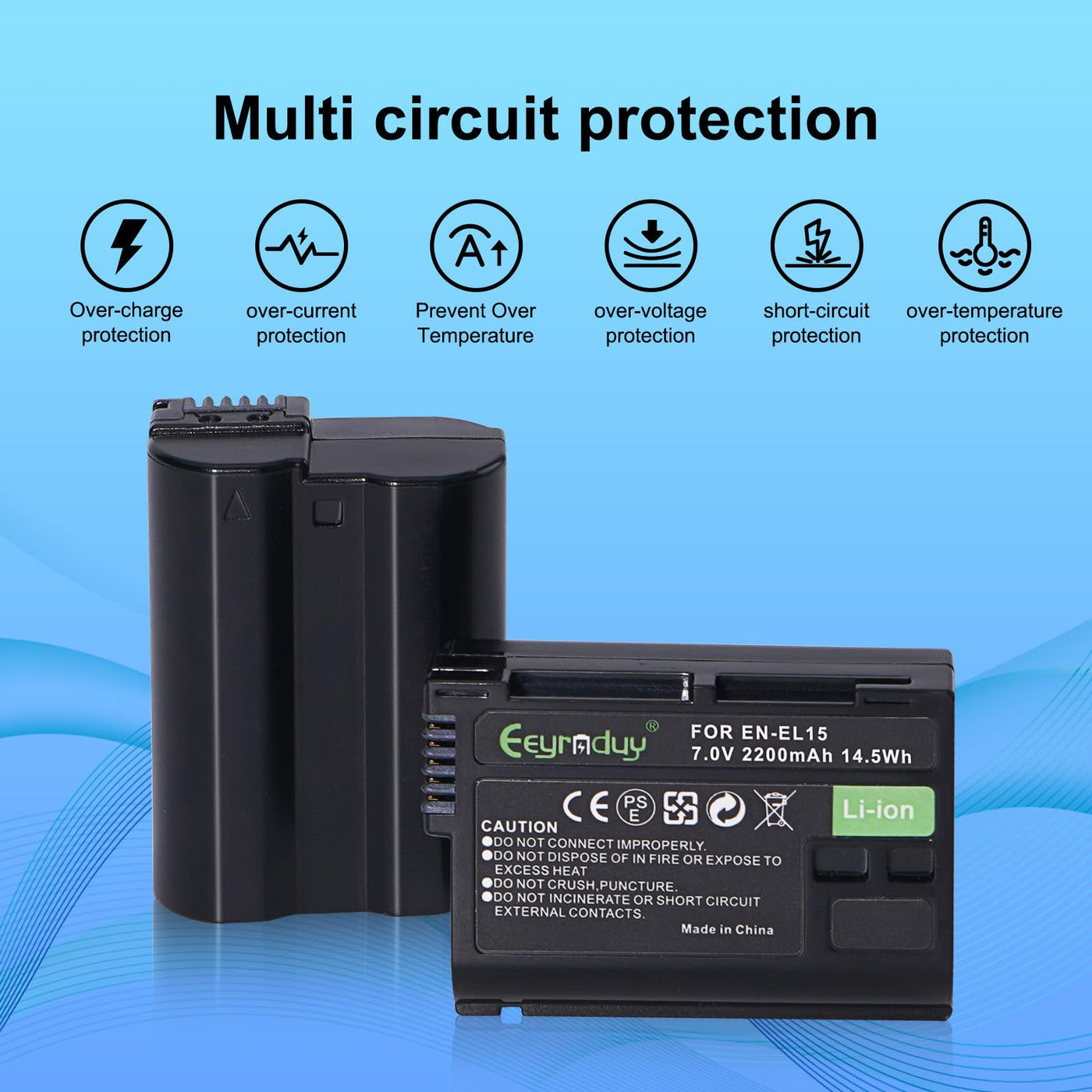 Q: What safety features do the Eeyrnduy EN-EL15 batteries include?A: The Eeyrnduy EN-EL15 batteries come with multiple circuit protection features, including short-circuit protection, over-voltage protection, over-discharge protection, and over-current protection, ensuring safe usage.