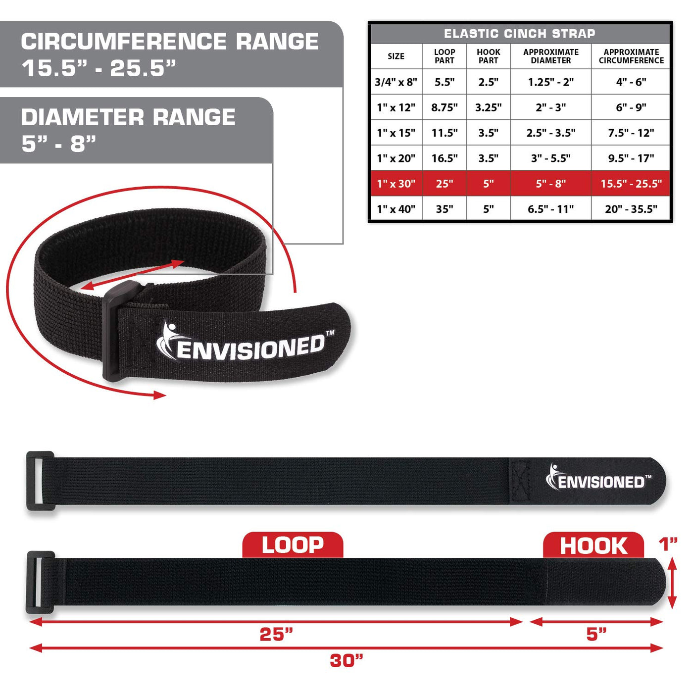 Envisioned Elastic Cinch Strapselastic - Stretchable, Adjustable, Reusable And Multi-Purpose. Wraps Onto Itself, Easy To Use, Easy To Open And Holds Strong! Stretches Up To 1 1/2 Times Its Length For Extra Strong And Snug Hold!Premium Quality - Parts Are Stitched Together For Extra Strength Instead Of Using Adhesives, Resulting In An Extra Strong Strap That Doesn'T Let Go Or Break Apart. Constructed Of Durable Strong Gripping Hook And Loop Nylon Material.Easy To Use - Our Cinch Strap Is Easy To Tighten, And With The High-Quality Materials That Were Used In Manufacturing These You Can Tighten The Strap To Hold Your Items Together With No Worry Of Them Becoming Undone!Sizes - Available In Different Lengths And Sizes To Suit Your Exact Needs. Multiple Straps Can Be Combined Together To Extend Their Lengths. See Images For Sizes. Don'T See The Size You Need? Please Let Us Know What You Are Looking For.Multi-Purpose - Perfect For A Number Of Purposes And Settings:Organizing Cablessecuring Itemsorganizing Bundles Of Things For Storagebike Rack Organizationkayak Strapstool Organizationladder Strapsmolle Strapsgarden Hose Organizationyoga Mat Strapcamping Gear Storagesleeping Bag Strapsextension Cord Strapsuse Our Elastic Cinch Straps For Any Storage Needs, In Your Home Or Garage, On Your Truck, Boat Or Car. It Is Highly Versatile To Handle Any Storage Or Securing Need!Click The Add To Cart Button To Get Yours Now!