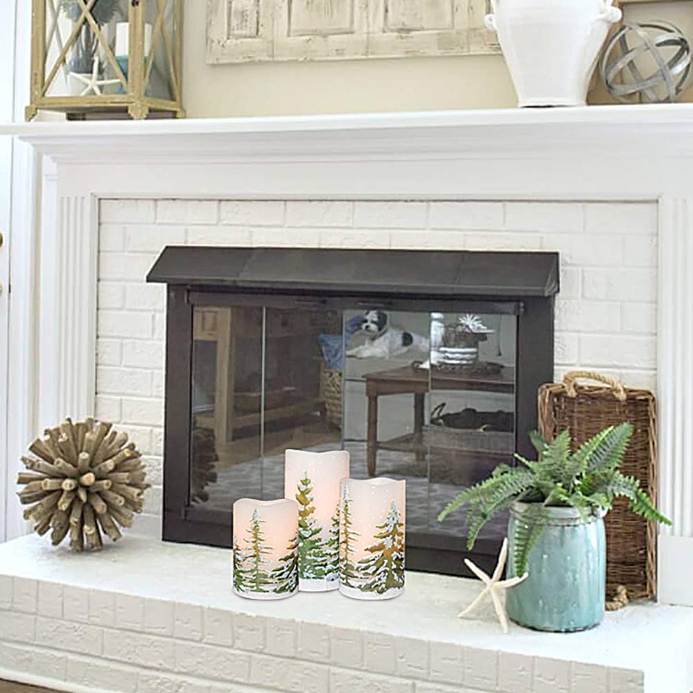 Eldnacele Green Tree Christmas Deco Flameless Flickering Candles With Automatical Daily Timers, Battery Operated Led Candles Real Wax Decals Pack 3 Tiered Pillars 3 X 4 5 6 Inches