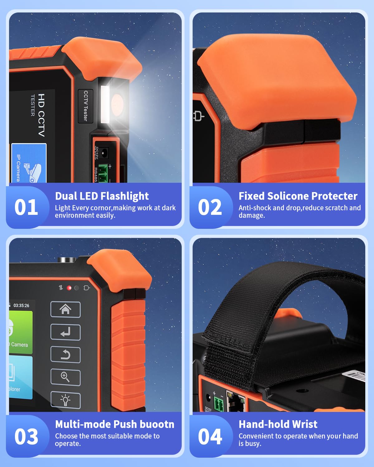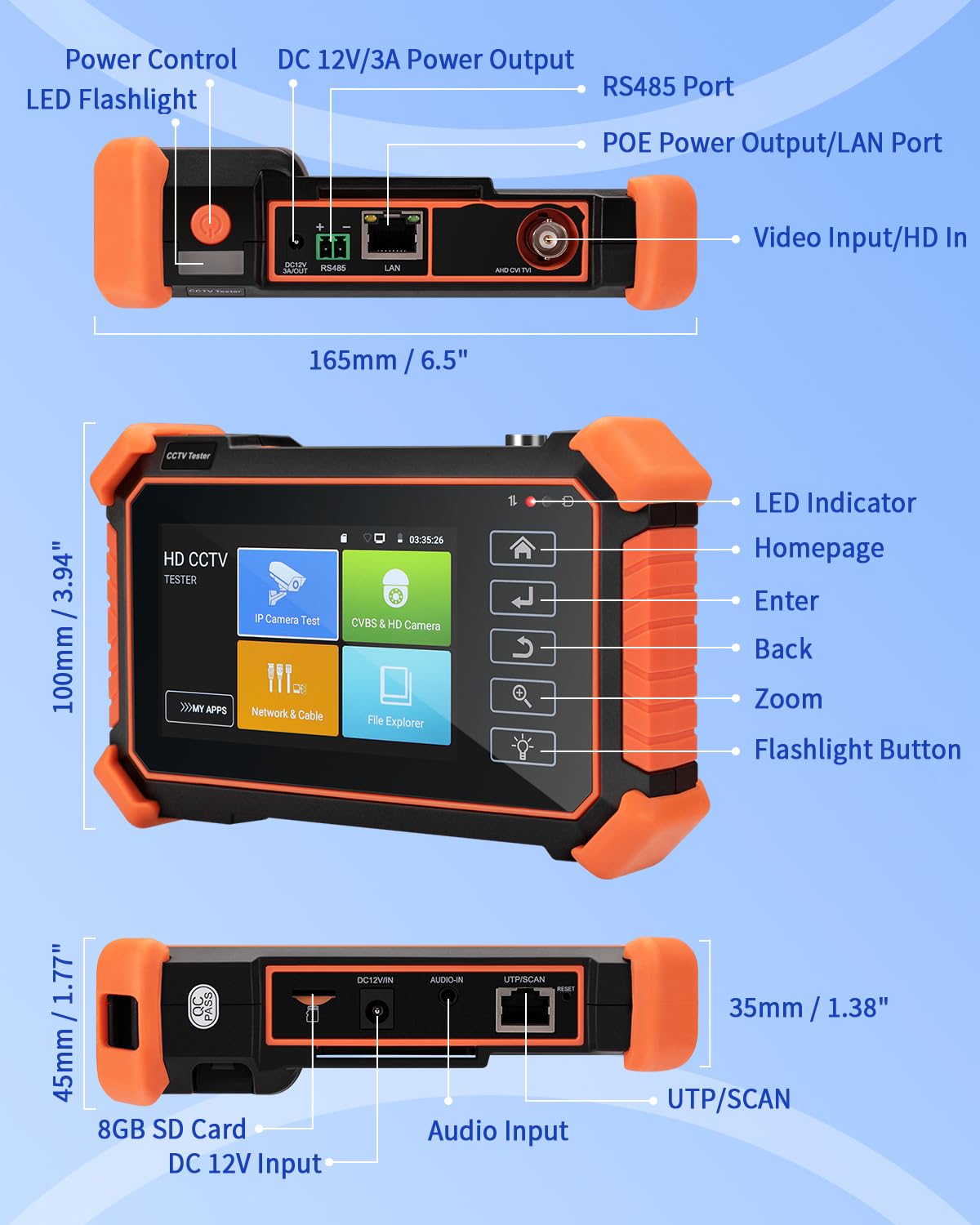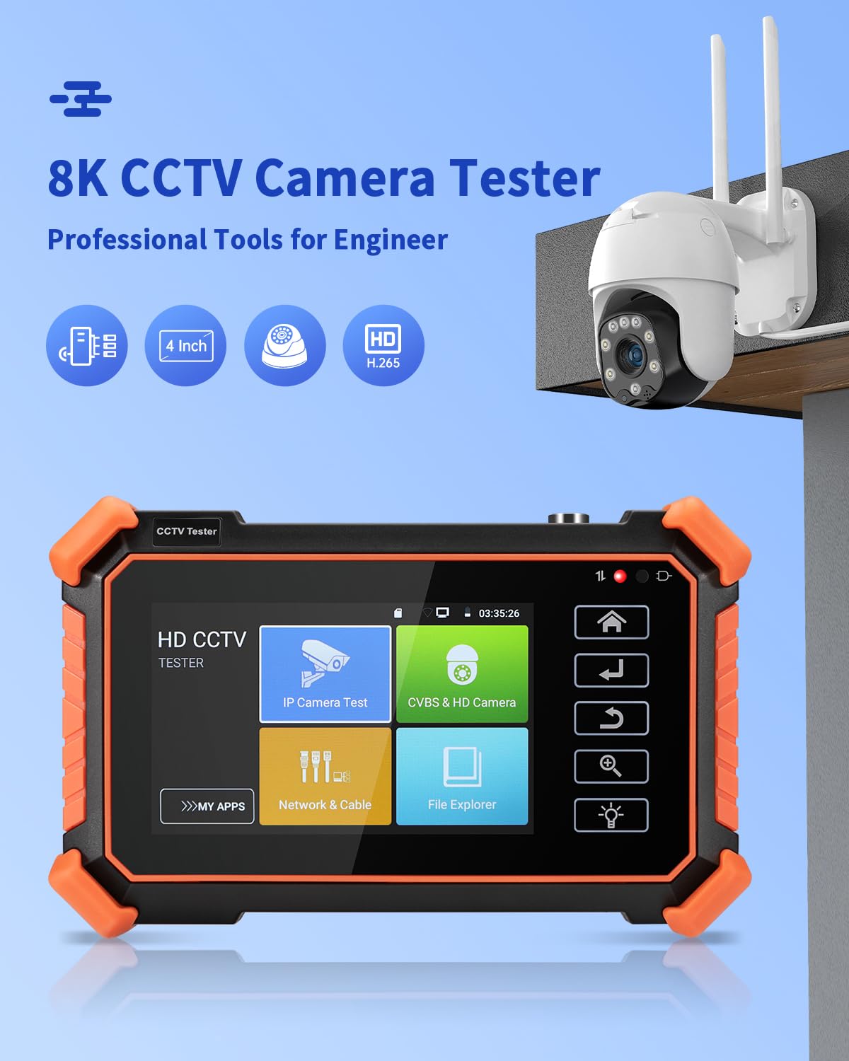 Works With Ip Cameras, Analog Cameras, Tvi, Cvi, Ahd Cameras, As Well As For Testing 4K H.264 /H.265 Connect To Wifi Cameras And To Create A Wifi Hotspot; Expecially For Ookla Speed Test Auto-Recognize Hd Coax Camera Type And Resolution Cable Testing - Rj45 Tdr Cable Test And Cable Quality Test; Utp Cable Test Detects Opens, Shorts And Miswires. Support Multi-Segment Ip Address Scan, Can Visually Display Camera Brand, Click Ip Address To Display The Image. Connect Ip Camera, Can Supply The Power To Poe Camera. Real-Time Display Network Port Connection Status. By One Key To Connect Camera Test Tool, Browser Can Login And Configure Camera. Designed For Batch Activating Hikvision And Dahua Cameras. When Hd Tvi, Cvi, Ahd Signal Input, The Tester Will Display The Image Resolution At The Top Of The Screen. Double-Taps On The Screen To Make The Image Displayed Full Screen. The Tester Supports Resolution Up To 3840 X 2160P 12.5/15 Fps. Ptz Control Network Tool Rj45 Cable Tdr Test Cable Tester Cable Tracer (* Optional ) Poe / Dc12V 3A Power Output Update File Explorer System Setting