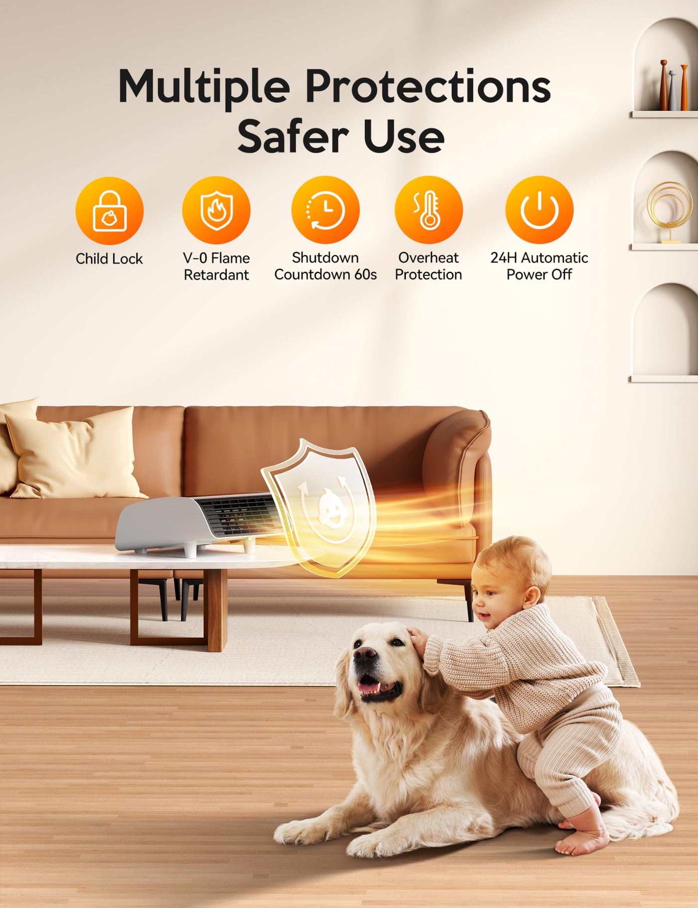 Q: What safety features does this heater have?A: This heater includes a multiple protection safety system featuring overheating protection, a child lock design, and is made from V-0 flame retardant material to ensure safety during operation.