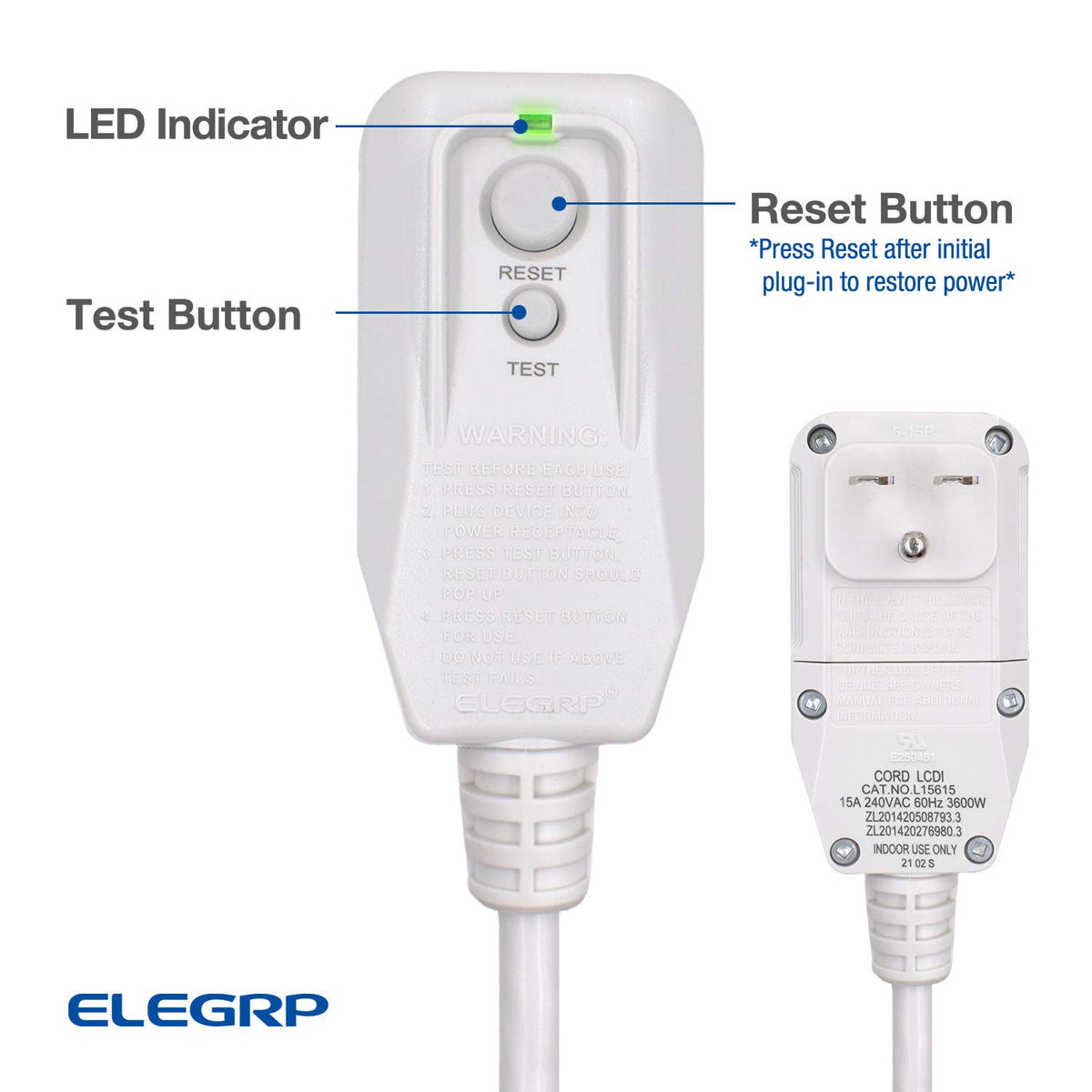 Elegrp 0661515Ly L15615 14Awg Lcdi Power Cord Plug For A/C Air Conditioner, 240Vac 15Amp 3600W 60Hz Nema 6-15P, E250451 Ul Certified, 7.5Ft Leakage Current Detection Interrupter Replacement (1 Pack)