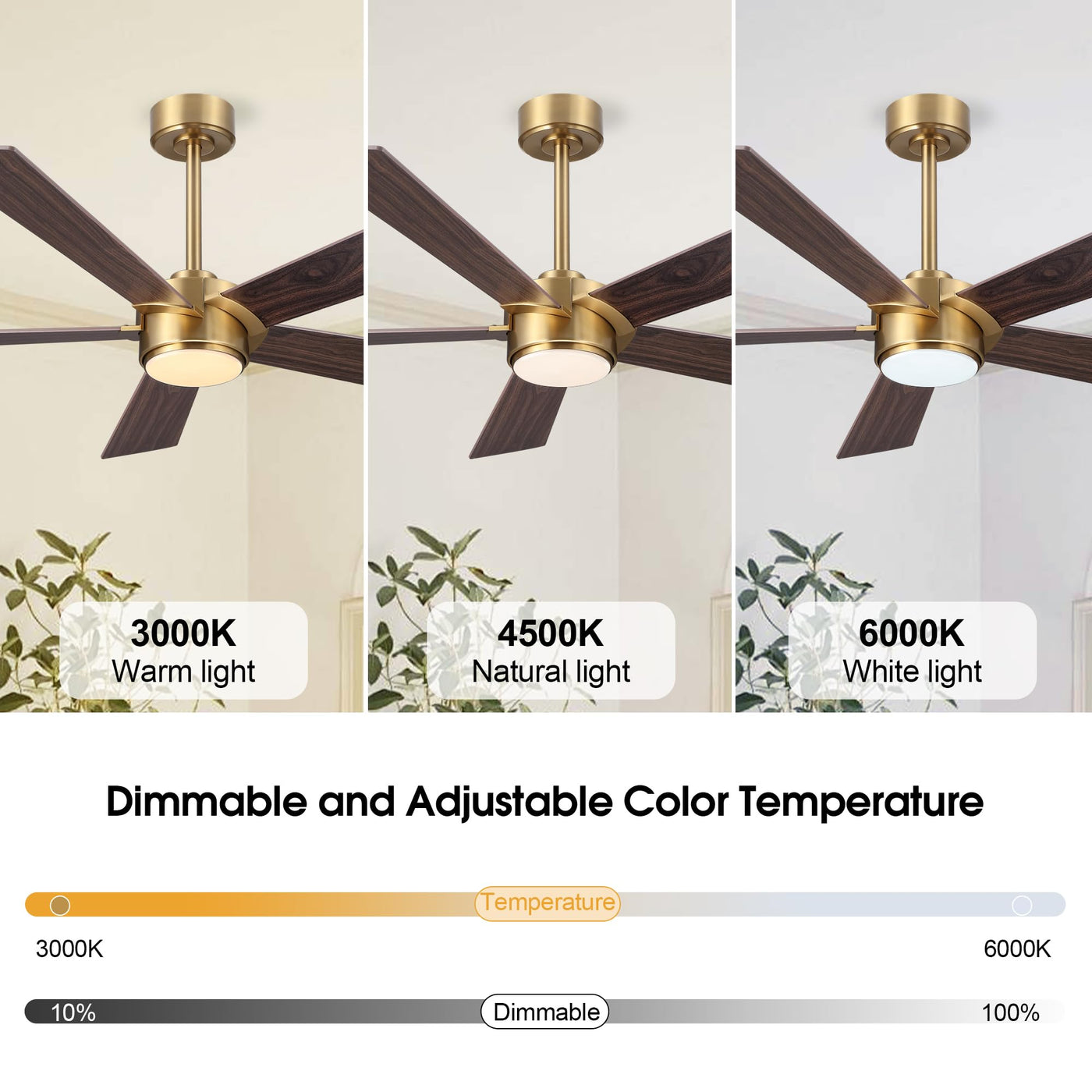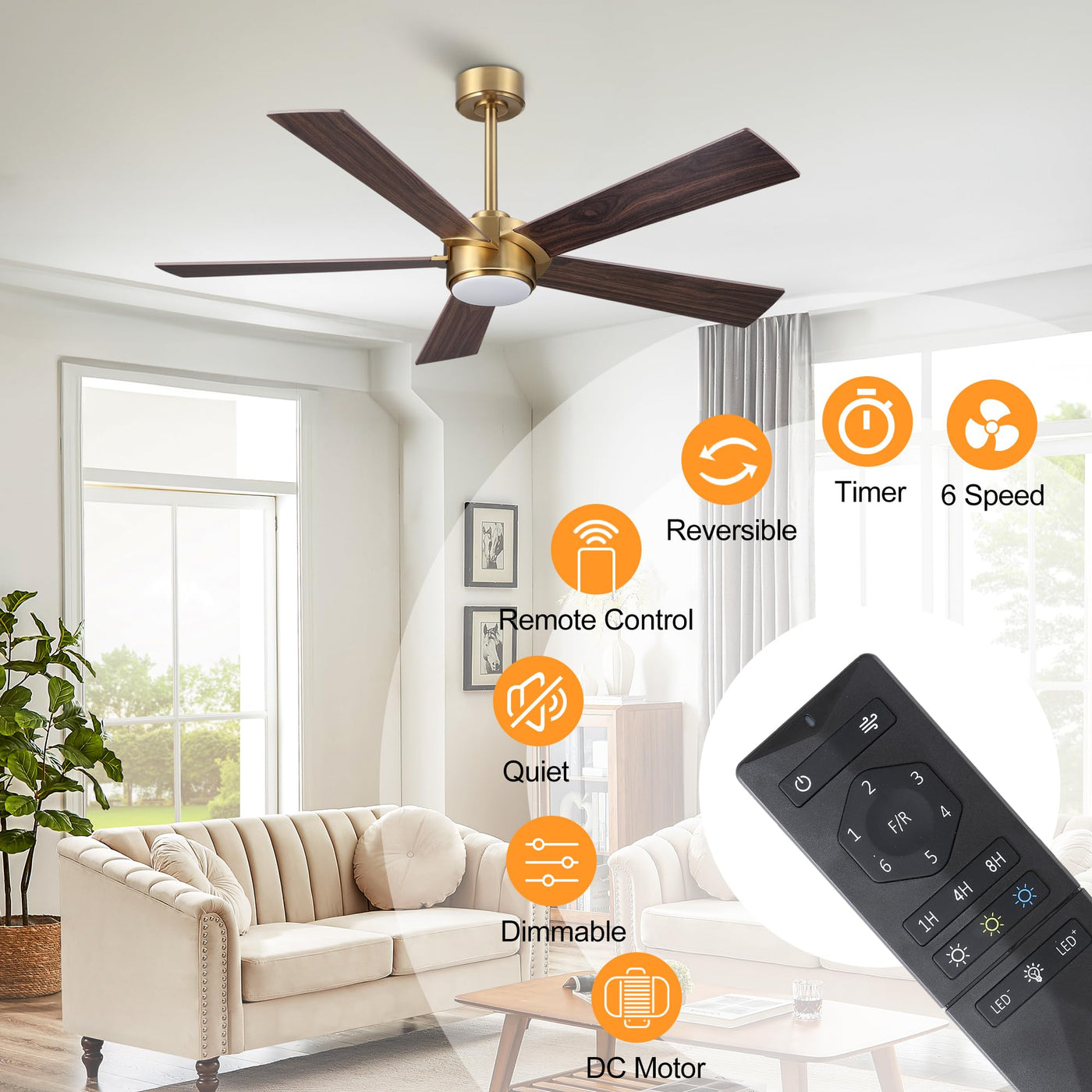Elehinser 54'' Ceiling Fan With Light And Remote Control , Modern Dimmable Led Light, 6-Speed Noiseless Reversible Dc Motor, 5 Plywood Ceiling Fan For Kitchen Bedroom Living Room Nab Gold/Walnut