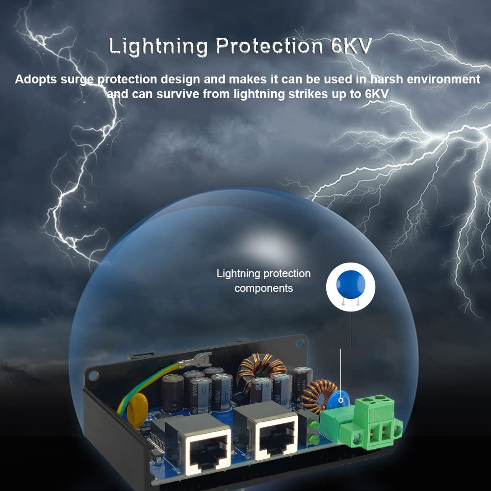 Q: What safety features does the Elenzk PoE Injector include?A: The Elenzk PoE Injector features 6KV lightning protection, ensuring safe operation in environments prone to electrical surges and providing peace of mind for users.