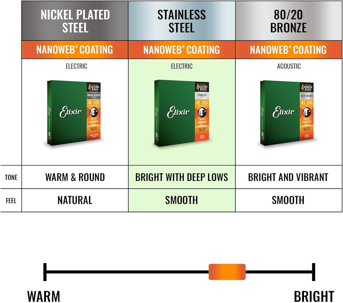 Prolong Your Tone With The Same Premium Electric Bass Guitar Strings That Experienced Players Worldwide Trust To Keep Their Incredible Tone Longer Than Any Other String Available Specially Developed Based On In-Depth Feedback From More Than A Thousand Bass Players Just Like You, Our Tailor-Made Selection Of Bass Strings Proudly Includes Nickel-Plated And Stainless Steel Construction Options, Four- And Five-String Sets, And Virtually Every Gauge Range You Could Possibly Need All With Our Innovative String Coating Technology And Unlike Other String Brands, Elixir Strings Coats The Whole String This Protects Not Only The Outer String Surface But Also The Gaps Between The Windings Where Common Tone-Deadening Gunk Typically Builds Up In Other Brandsa Coated And Uncoated Guitar Strings Who Wouldnat Love More Quality Playing Time Between The Hassle And Cost Of String Changes Elixir Strings Has Re-Invented The Stainless Steel Bass String Carefully Designed To Enhance Everything You Love About Stainless Steel And Minimize Everything You Donat (Including Its Notoriously Shrill Sound), These Electric Bass Guitar Strings Boast A Bright, Stainless Tone With Deep Lows Meanwhile, The Ultra-Thin Nanoweb Coating, Redesigned Specifically For Bass Guitars, Allows A Smooth, Natural Feel That Also Enhances Grip And Reduces Finger Squeak For A Richer, More Rounded Bass Tone, Try Our Nickel Plated Steel Bass Strings With Nanoweb Coating Of Course, The Kind Of String You Play Is All A Matter Of Personal Preference Not Sure What Tone Is Right For You Try Them Out For Yourself, And Find Your New Favorite String From Elixir Strings For A More In-Depth Look At What Makes Our Strings So Special, Scroll To The Branded Info Further Down The Page Elixir Strings: Great Tone Long Life