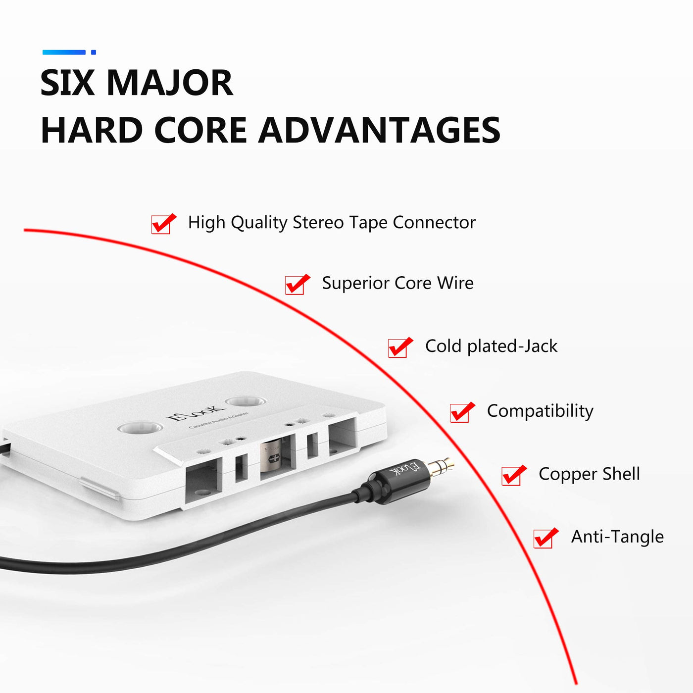 Half Classic, Half Trend. Connected Through An Adapter, You Can Form A Wonderful World. Elook Cassette To Aux Adapter Provides You With A Satisfying Musical Enjoyment. Can Be Plugged Into Any Phones, Tablets, Mp3 Players, Car Stereo, Headphones, Hi-Fi, Portable Speaker Or Other Devices Equipped With Standard 3.5Mm Audio Jack Or Aux-In Port. Fits For Most Car Cassette Player. Made With Intentional Materials And Workmanship. Simple Design, Easy To Use. High Quality Matte Casing. Stereo Magnetic Head, Improving Sound. Metal 3.5Mm Aux Head With Strong Compatibility. Thickened Audio Cable, More Durable. Package Includes: 1 * Cassette Adapter White 1 * Instruction 1 * Serve Card Worry-Free Ater-Sale Service Elook Customer Service Team Offers 12-Month-Replacement. Every Member Is Always Ready To Solve Your Inquiry. Please Feel Free To Contact Us For Any Product Questions.