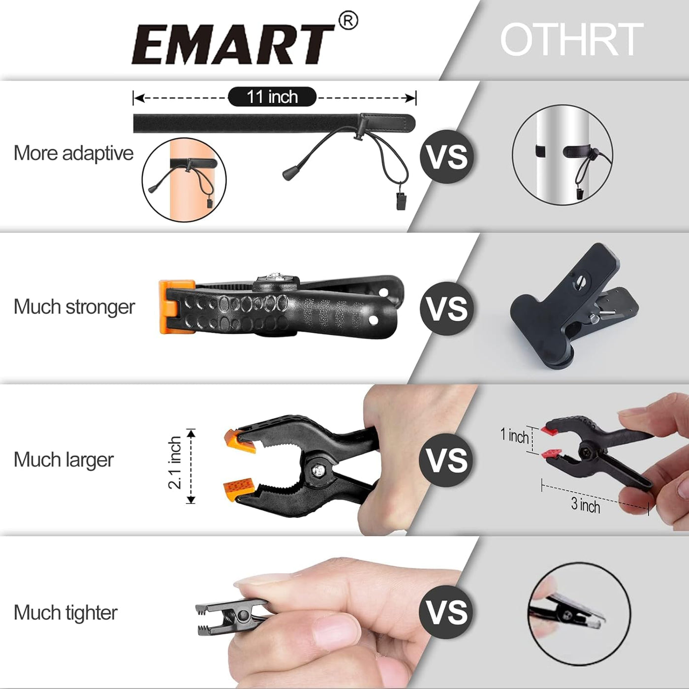 4.5 Inch Heavy Duty Spring Clamps And Background Clips, Emart Heavy Duty Clip For Muslin Backdrop, Photo Studio, Photography Backdrop Support - 14Pcs Specifications: Clamps Quantity: 6 Pack 4.5 Inches Long 3/4'' X 5/8'' Rugged, Pivoting Pads Weight: 8.8 Oz Maximum Opening: 2 Inch Mouth Nylon Clips Quantity: 8 Pack Length: 38 Cm/ 15 Inches Consist Of Metal Clip, Stretchy Cords, Locking Release Tabs And Hook-And-Loop Part. Floor. Package Include : 6 X Spring Backdrop Clamp 8 X Clips