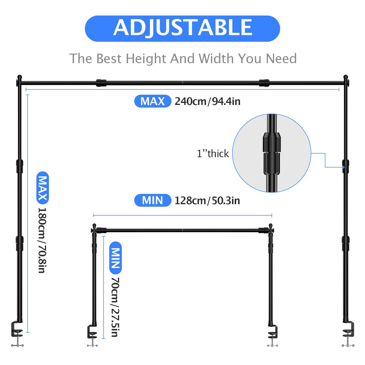 Q: What is the height and width adjustment range of the EMART Telescopic Over The Table Top Rod Stand?A: The EMART Telescopic Over The Table Top Rod Stand can be adjusted in height from 27.5 inches to 70.8 inches and in width from 50.3 inches to 94.4 inches, making it suitable for various event scales.