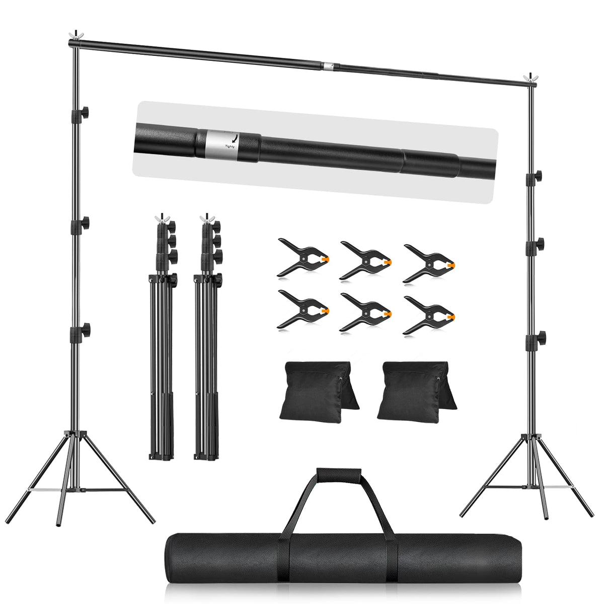 Q: What accessories come with the backdrop stand kit?A: The kit includes two support stands, one crossbar, six heavy-duty spring clamps, two sandbags for added stability, and a portable carrying bag, providing everything you need for a complete setup.