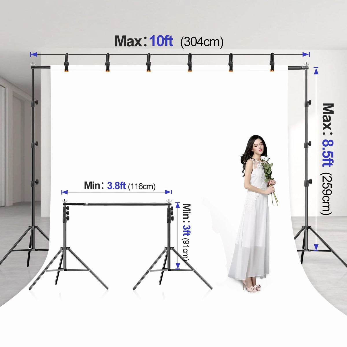 Package Include: (2) X Support Stand, (1) X Crossbar, (6) X Spring Clamp, (2) X Sand Bag, (1) X Portable Carrying Bag. | Tripod Support Stand: Adjustable Height (Min 3Ft - Max 8.5Ft), The Folded Size Is 2.5Ft. Made Of 100% Aluminum Material, Stable And Sturdy. Suitable For Parties, Studio Or Wedding. | Telescopic Crossbar: Adjustable Width (Min 3.8Ft - Max 10Ft). With Convenient Twist Locking Design, You Can Stretch Or Shorten The Crossbar Easily. | Complete Accessories: Come With 6Pcs 4.5
