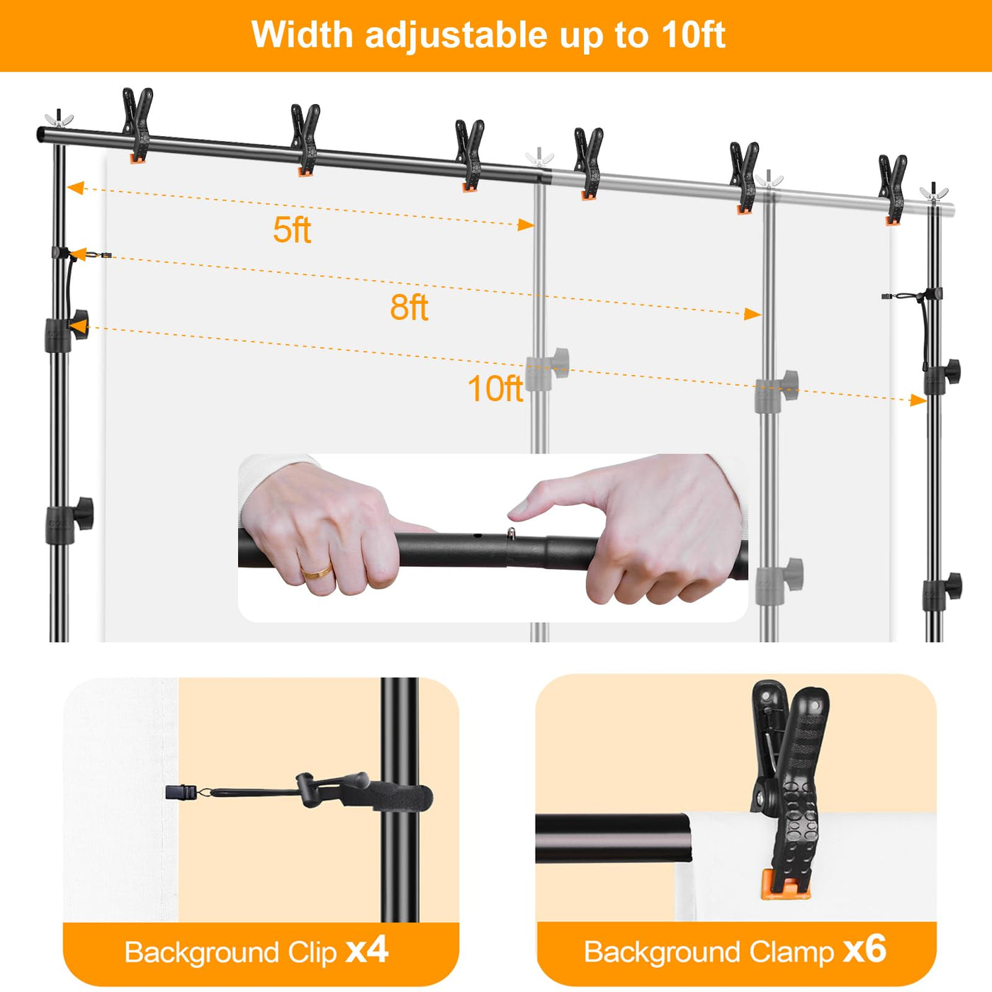 ?Super Simple Setup?The Upgraded Backdrop Stand Has A Simple Installation Method, Which Is Perfect For Indoor And Outdoor Activities. The Contents Of The Product Include: Clamps X 6, Clips X 4, Sandbags X 2, Light Stands X 2, Crossbars X 4 & Portable Bag X 1. | ?Adjustable Backdrop Stand?The Size Of The Backdrop Stand Is 8.5X10Ft, And The Height And Width Can Be Adjusted Freely. Easy To Adjust And Lock Through The Knob, No Need For Help, Can Be Easily Done By Yourself. | ?Strong Background Fixture? Spring Clamps And Clips Are The Perfect Partner Of The Backdrop Stand, They Can Install The Background Cloth, Balloons, Tulle, Seamless Paper, Curtains, Light Strings And Other Decorations On The Crossbar Without Moving Easily. | ?Use More Sturdy&Stable?Stronger Base With Our Included Sandbag Bag, Give You Double Solid Support, Will Not Easily Tip, Suitable For Indoor And Outdoor Diverse Environment. Environments. | ?Super Portable?This Backdrop Stand Made Of Premium Quality Metal And Is Lightweight & Portable. And It Is Equipped With A Portable Bag, Which Can Put All Products Into It. It Can Be Stored In The Corner, In The Cupboard, Under The Bed Or In The Trunk Of The Car
