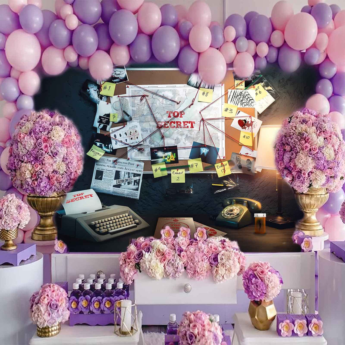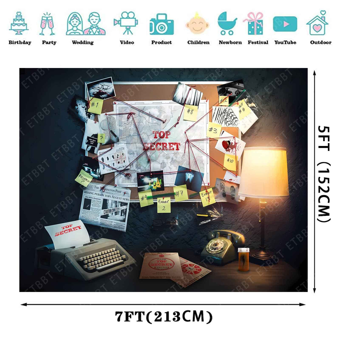 Q: What is the size of the EMDSPR Detective Backdrop?A: The EMDSPR Detective Backdrop measures 7 feet wide by 5 feet high (213 x 153 cm), making it suitable for various events and photography needs.