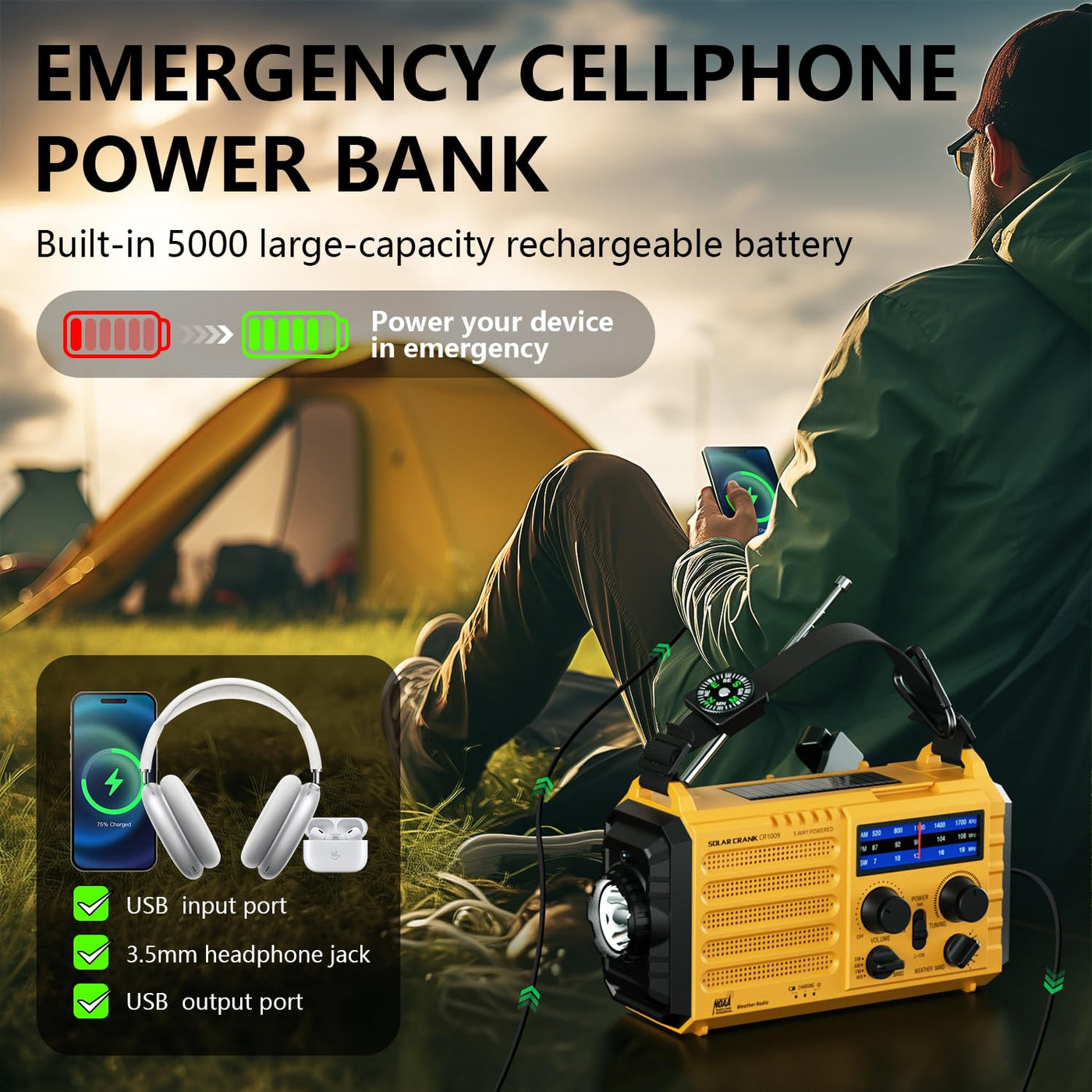 Emergency Weather Radio, 5 Ways Powered Crank Solar Radio, Portable Am/Fm/Sw/Noaa Weather Radio Battery Operated With Cellphone