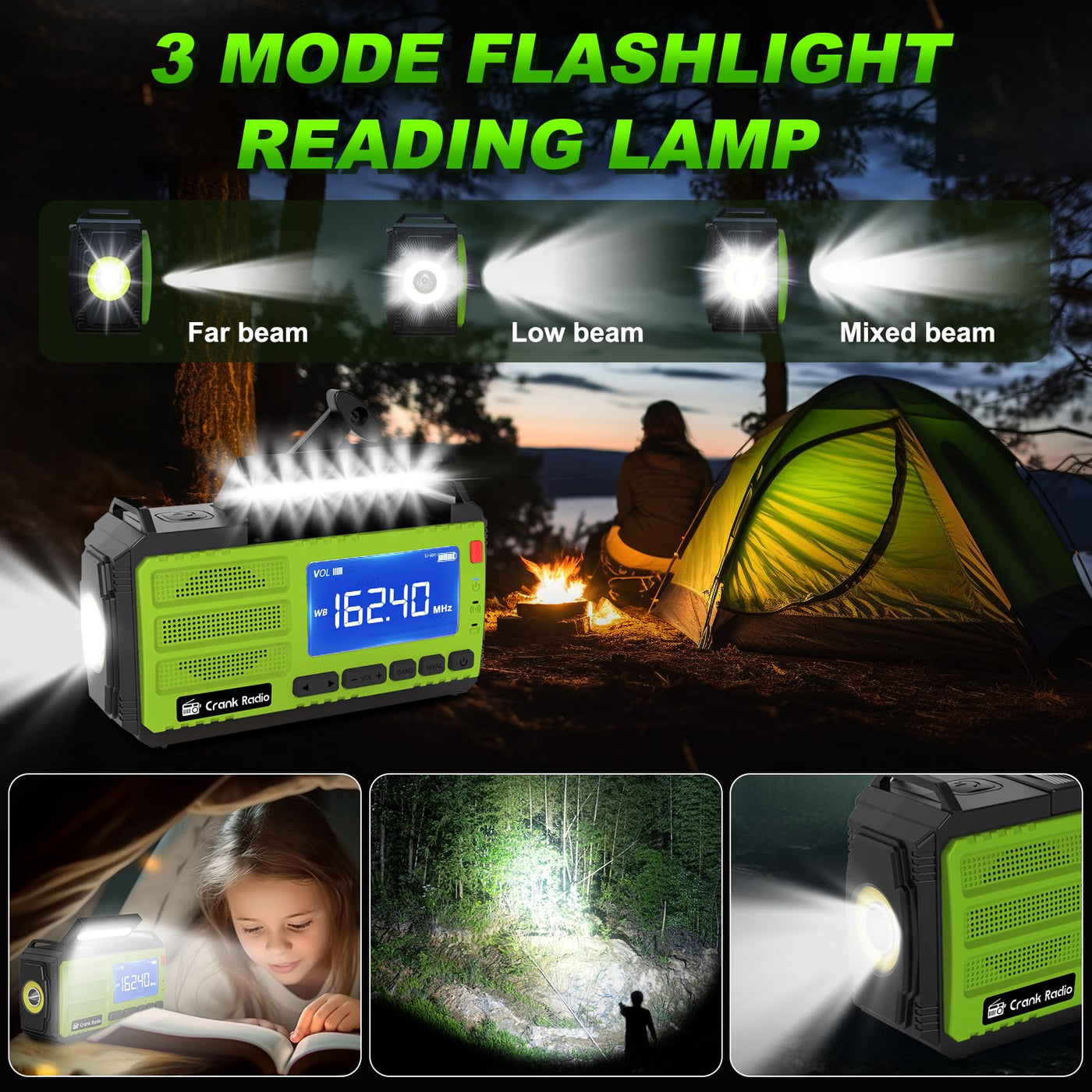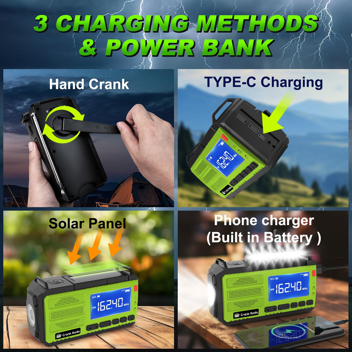 [ Automatic Noaa Weather Alert Radio ] - Your Ultimate Companion For Staying Informed During Emergencies. With Weather Scan, It Automatically Scans Through 7 Available Weather (Wx) Band Channels When Activated Or In Standby Mode, Ensuring You Never Miss A Crucial Alert, Even While Asleep. Say Goodbye To The Need For Constant Weather Monitoring - This Radio Does The Work For You, Specially Designed To Meet Emergency Needs. Whether Facing Tornadoes, Tsunamis, Wildfires, Hurricanes, Or Snowstorms, Trust This Noaa Weather Alert Radio To Be Your Essential Emergency Kit, Keeping You Safe And Informed When It Matters Most.&Nbsp; &Nbsp;[ 10,000Mah Emergency Radio And 3 Charging ] This Hand Crank Emergency Radio Lies A Powerful 10,000Mah Rechargeable Battery And Offering 3 Charging Methods - Hand Crank, Solar Panel, And Internal Lithium-Ion Battery - It Guarantees Resilience And Versatility. Never Worry About Power Outages Again. This Emergency Crank Radio Designed To Keep You Connected For Extended Periods Without Interruption. Whether You'Re Facing Power Outages, Natural Disasters, Or Remote Outdoor Adventures, This High-Capacity Battery Ensures That Your Radio Remains Operational When You Need It The Most. [3 Mode Emergency Flashlight &Amp; Reading Lamp And Sos Alarm]-The Emergency Crank Radio Builted-In Super-Bright 3W Flashlight And 2.5W Reading Lamp Are Critical If The Power Outage. It Also Includes A Usb Connector Used To Charge Your Usb-Enabled Smart Devices For Communication. Simply Press The Sos Button That Activated A Loud Alert Partnered With An Eye-Catching Flashing Red Light For Emergency Assistance .[ Portable Radio With Headphone Jack ] - Your Compact Companion For On-The-Go Listening. Small, Light, And Ipx3 Water-Resistant, It'S Effortlessly Portable, Accompanying You Wherever You Roam. With A Convenient 3.5Mm Headphone Jack, You Can Tune Into Weather Broadcasts Discreetly, Without Disturbing Your Fellow Travelers. Perfect For Outdoor Enthusiasts, Whether Fishing, Camping, Or Hiking, This Radio Keeps You Well-Prepared With Weather Alerts, Ensuring Safety And Peace Of Mind During Your Adventures [ Large Hd Lcd Digital Screen Weather Radio ]. Experience The Future Of Radio With Its Expansive Lcd Screen, Making Station Searches A Breeze. All Essential Information, From Radio Frequency To Battery And Charging Status, Is Displayed Clearly, Ensuring Effortless Navigation. Easily Access Accurate Am/Fm/Sw/Wb Information, With The Battery Level And Tuning Frequency Readily Visible. Stay Informed And In Control With This Cutting-Edge Radio, Where Every Detail Is Crystal Clear On Its Large Hd Display.