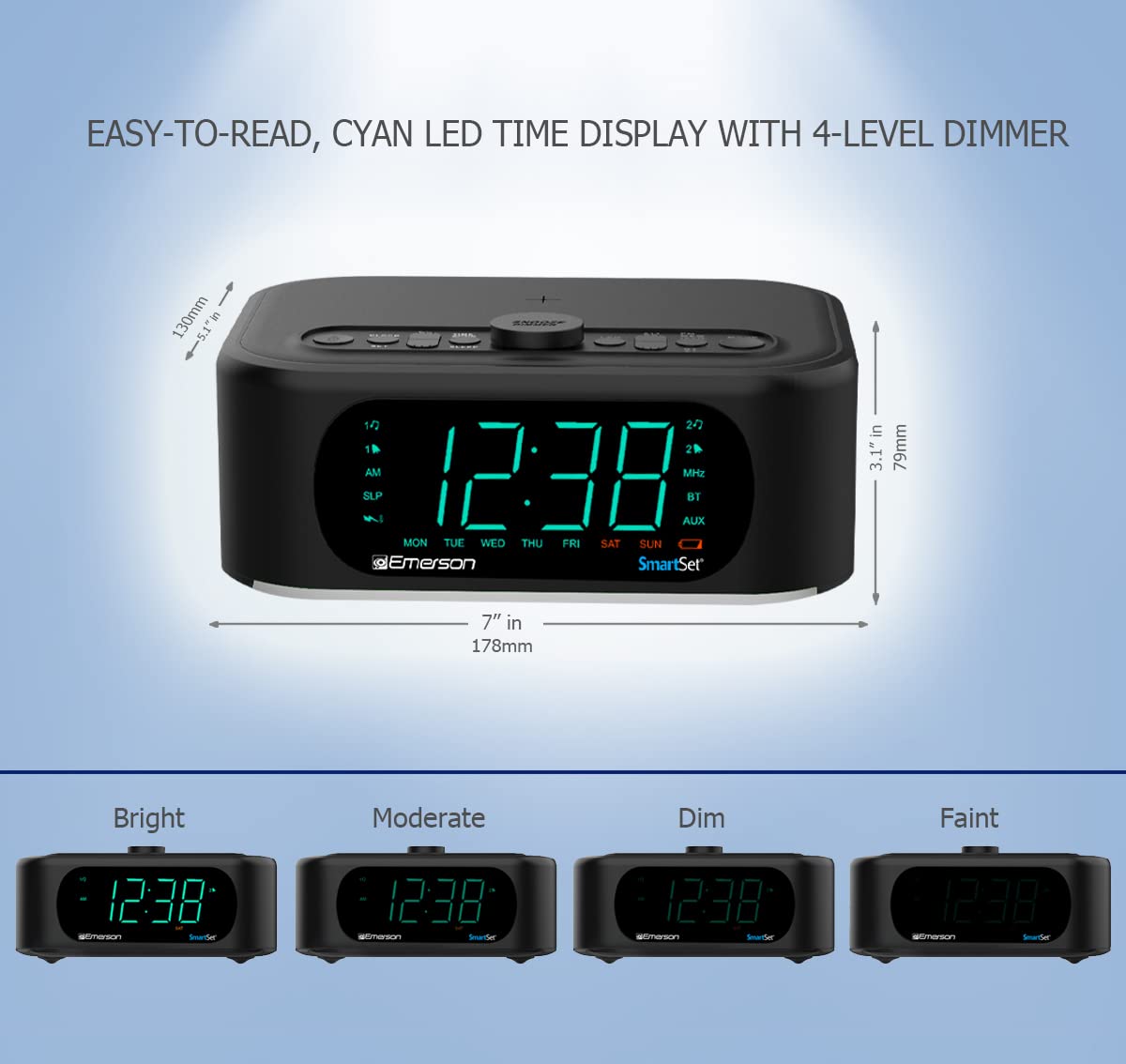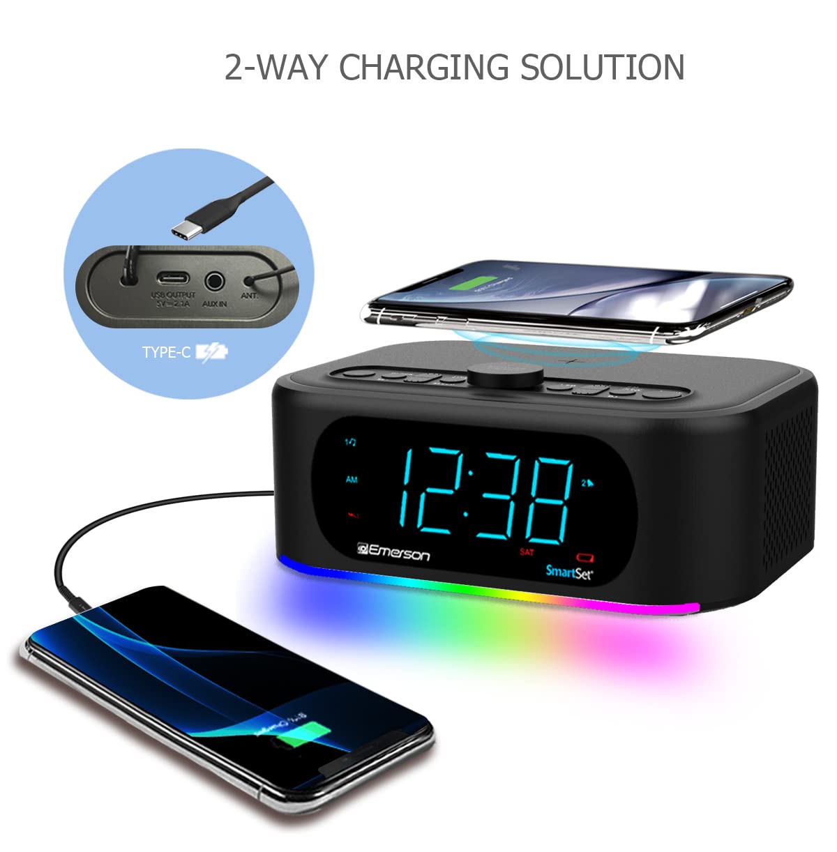 The Emerson Bluetooth Speaker Offers A Dynamic Audio Experience With Led Lights Pulsing To The Rhythm Of The Music. Featuring A 5W X 2 Output Power With A Passive Radiator, This Speaker Produces High Quality Sound. The Dimmable 7-Color Mode Night Led Creates A Relaxing Ambiance. You Can Charge Your Mobile Devices Wirelessly At An Ultra-Fast Speed Of 15W Using The Type C Usb Port. Bluetooth V5.3 Technology Enables Easy Pairing And High-Speed Data Transfer Within A Range Of Up To 10 Meters. The Patented Smartset Automatic Time Setting System Ensures The Clock Sets Itself To The Correct Year, Month, Date, Day, And Time As Soon As It'S Plugged In And After Every Power Interruption, Including Auto Dst. The Dual Alarm Feature With A Choice Of 3 Alarm Modes And Week Indication Keeps You On Schedule. Other Features Include A Digital Tuning Pll Fm Radio, Easy-To-Read 1.2 Cyan Led Clock Display With 4-Level Dimmer Control, Button Cell Battery To Maintain Time And Alarm Settings, Touch Button To Display Month/Date, Wake To Radio Or Buzzer Alarm With Volume Control, Programmable Sleep-To-Music Timer, Snooze/Repeat Alarm, And Crescendo Wakeup Control.
