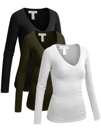 Emmalise Womens Junior And Plus Size Vneck Tshirt Long Sleeves Shirt Tee, Small, 3Pk Black, Olive, White