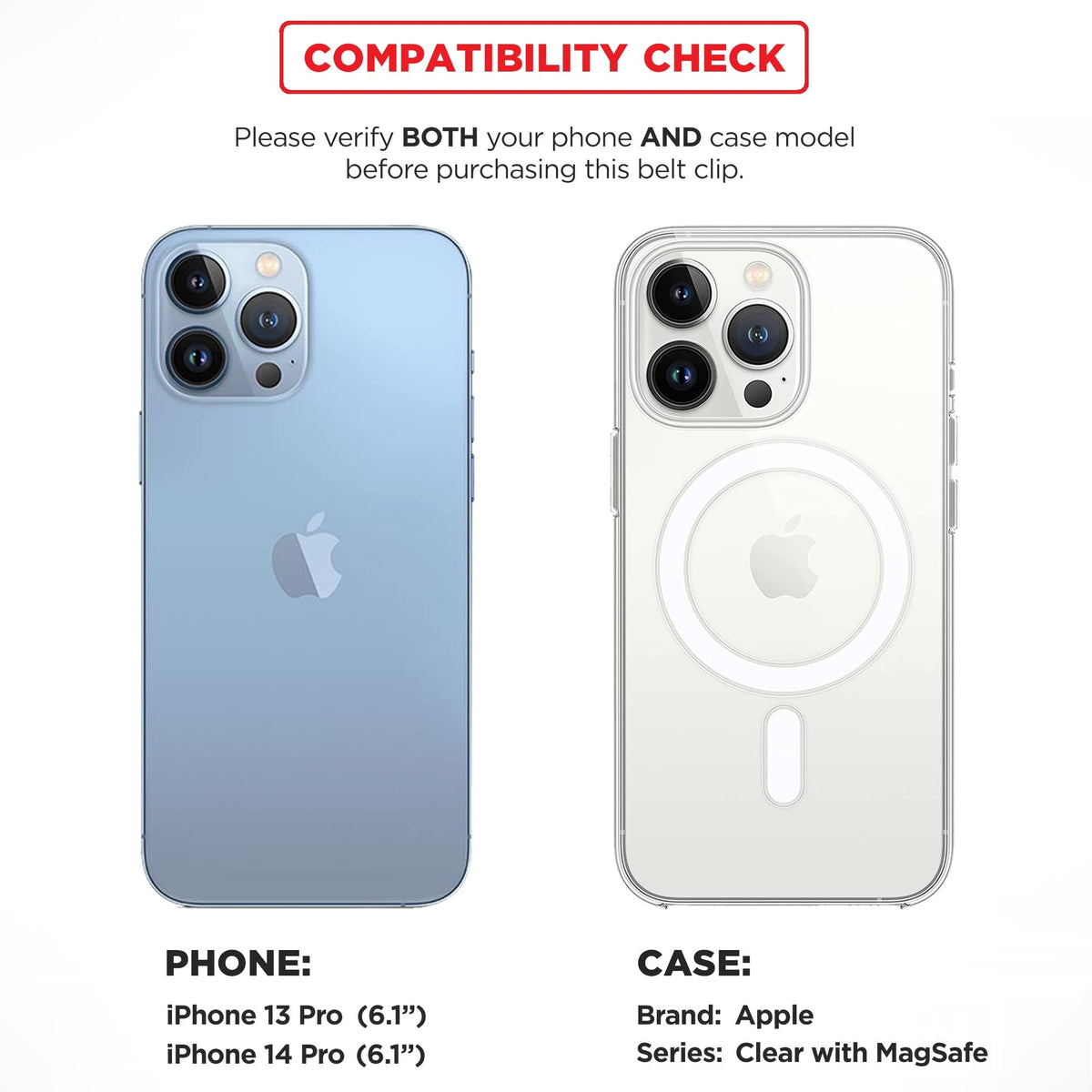 Q: Is the Encased Belt Clip compatible with other phone cases?A: The Encased Belt Clip is specifically designed to work seamlessly with the original Apple Clear-back MagSafe Case for the iPhone 13 Pro and iPhone 14 Pro. It is not compatible with other phone cases.