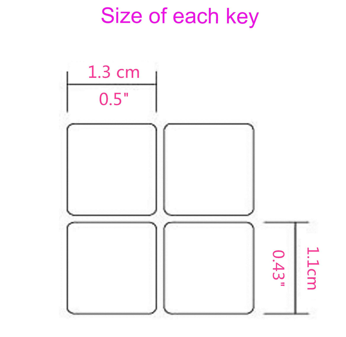 Q: What are the dimensions of each keyboard sticker?A: Each sticker measures approximately 1.1 cm x 1.3 cm, making them a perfect size for standard keyboard keys.