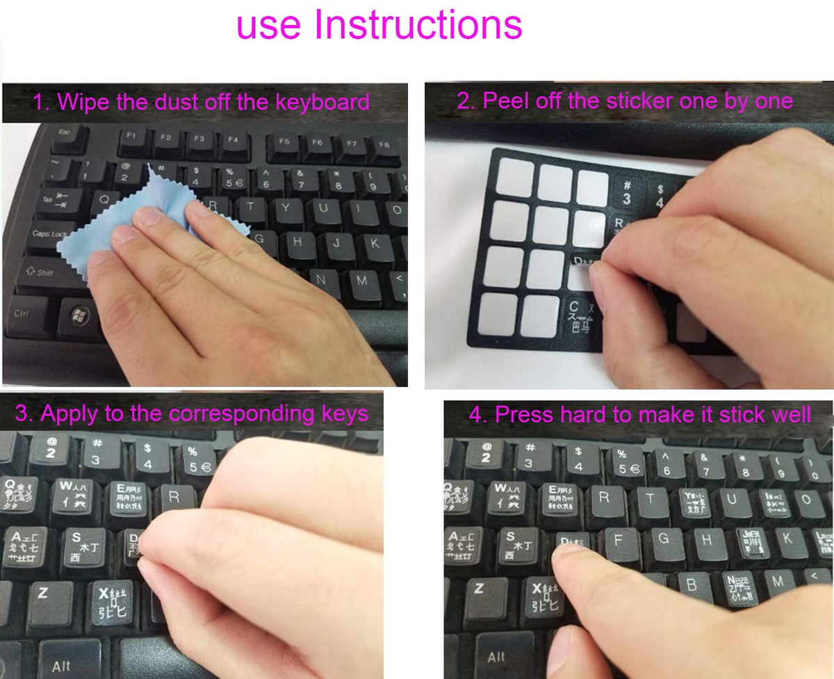 Q: How do I apply the keyboard stickers properly?A: Before applying the stickers, make sure to clean and dry your keyboard thoroughly. This step is crucial for ensuring that the stickers adhere properly and last longer.